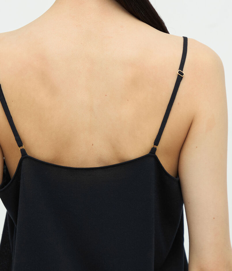 肩紐はアジャスタブルでスパゲティストラップに細く編み立てており、繊細で洗練された印象の一枚。