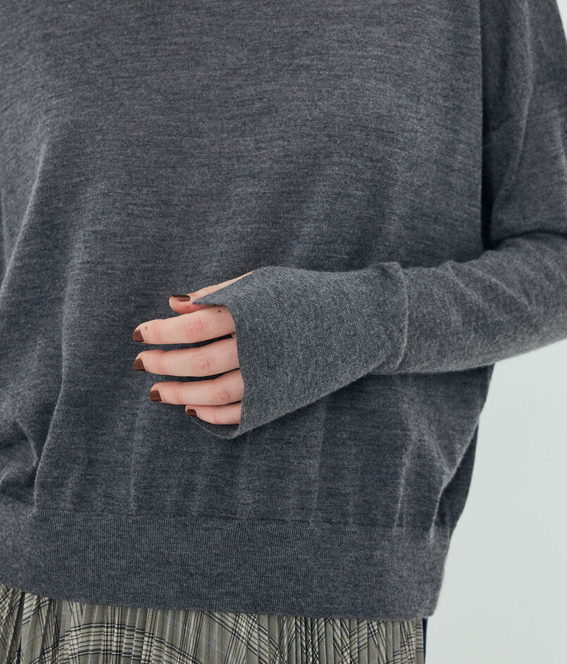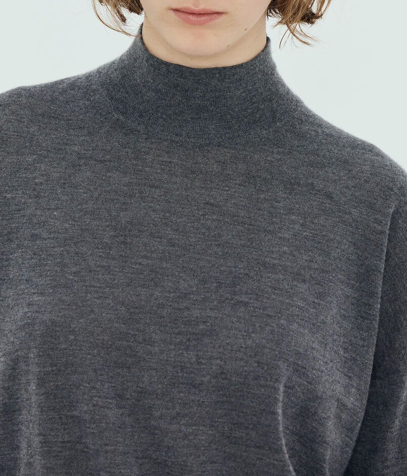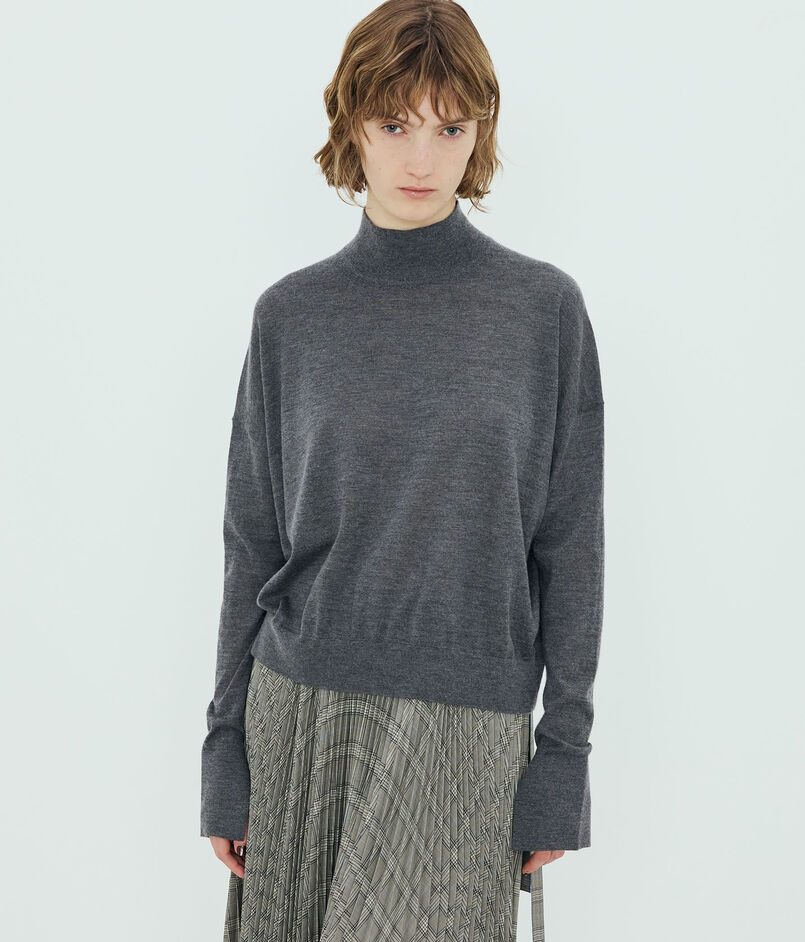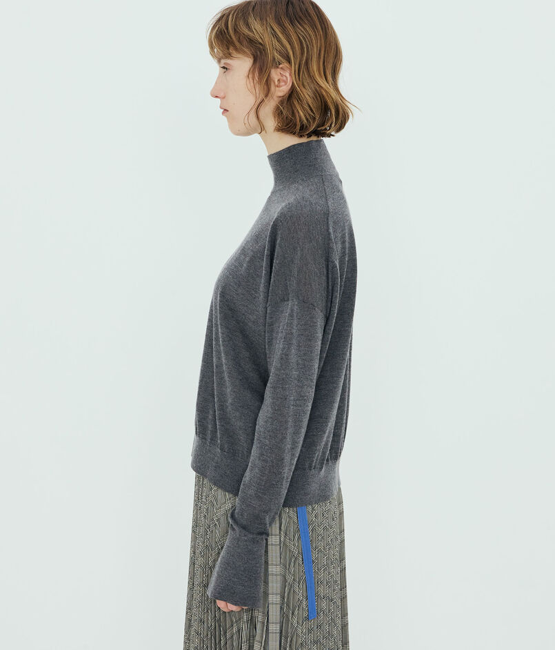 身幅にゆとりを持たせた緩みのあるシルエットのモックネックニット。