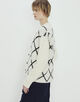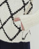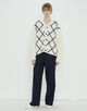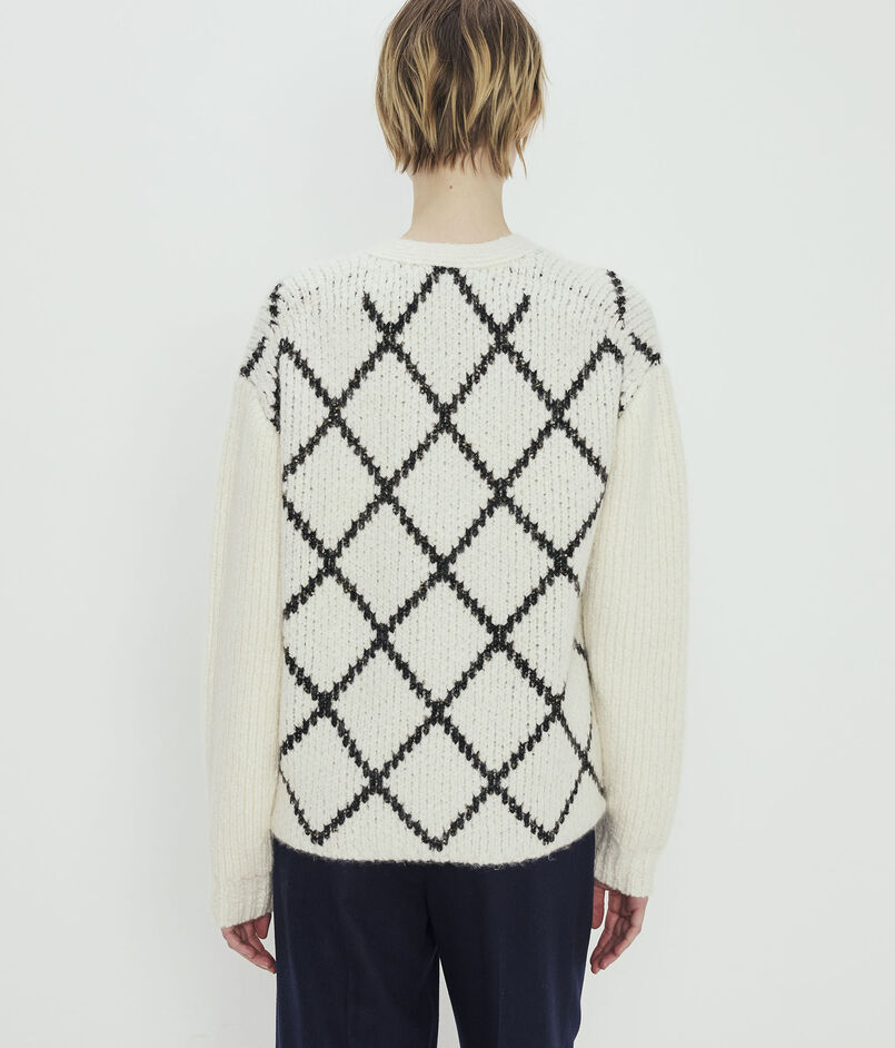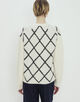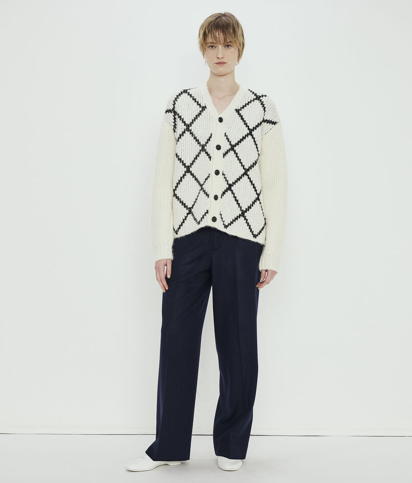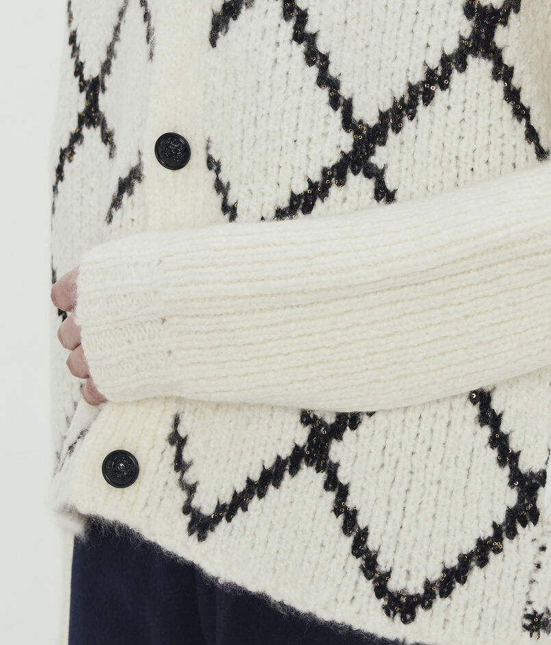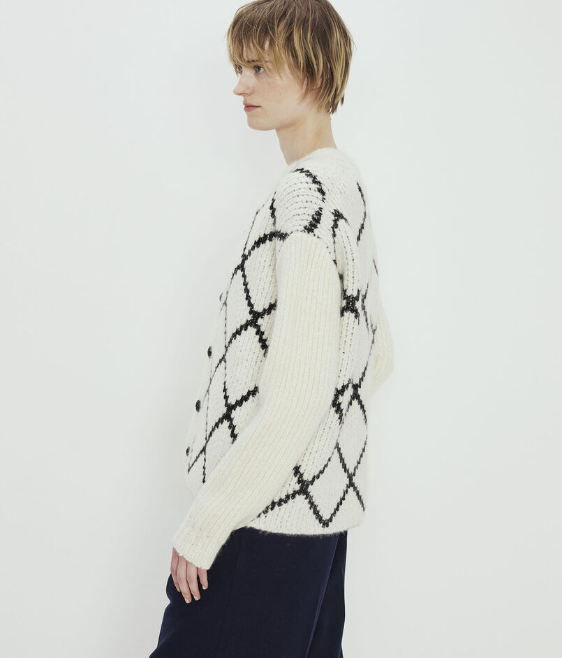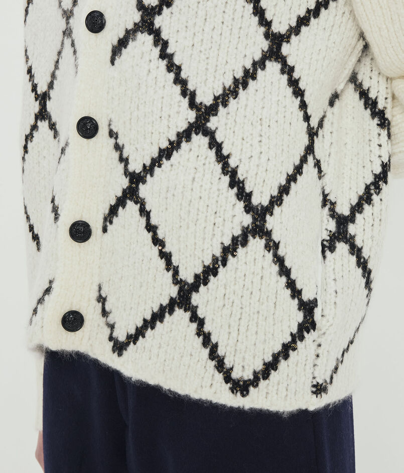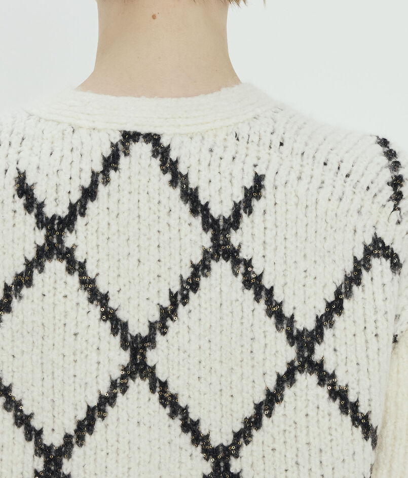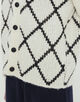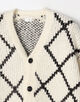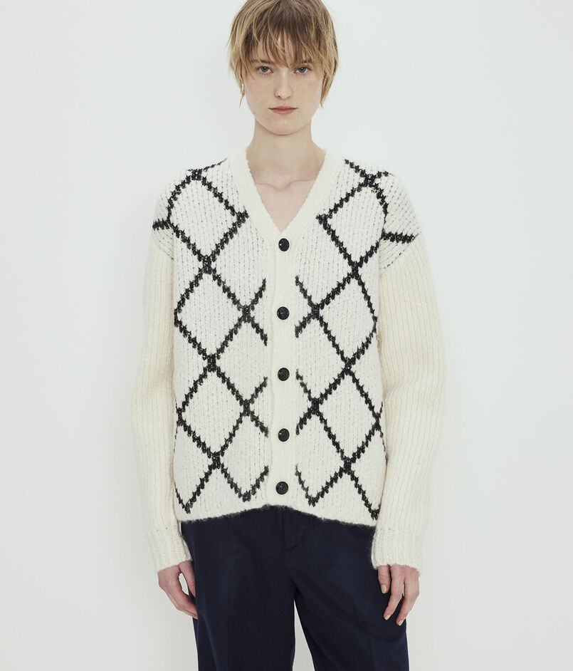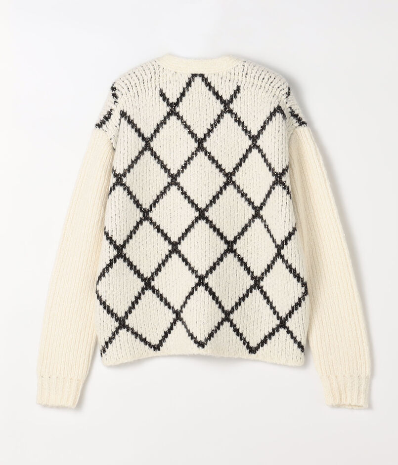 浅めのVネックのカーディガンは身頃にはダイヤモンドチェックを、袖はすっきりとした無地のデザインに仕上げました。