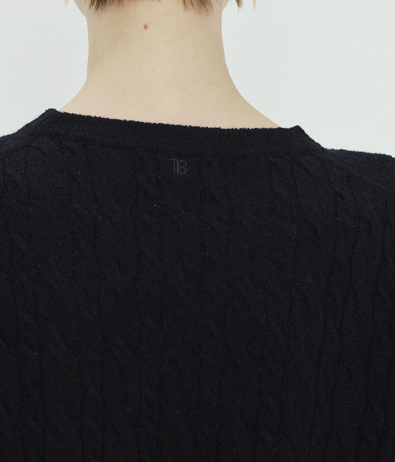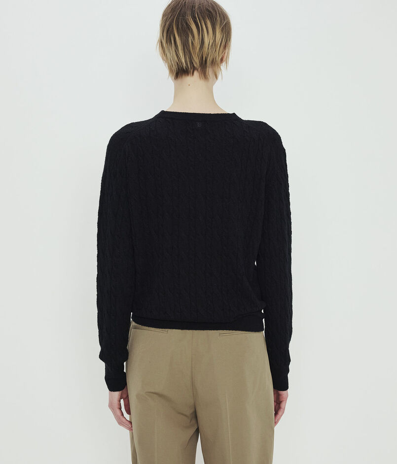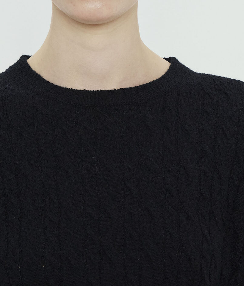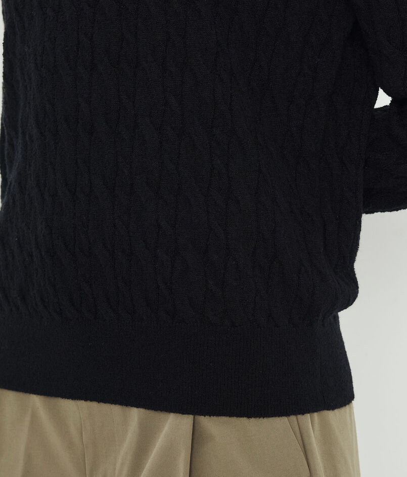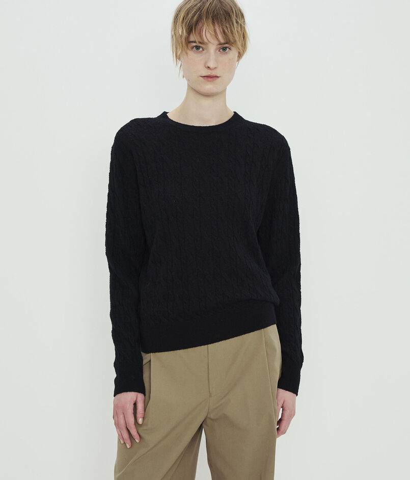 立体感を引き出すケーブル編みのクルーネックプルオーバー。