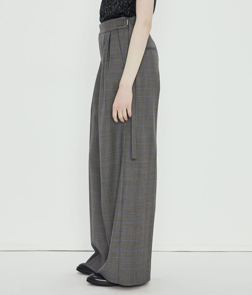 2タックのワイドパンツは、サイドのバックルでギュッと絞めて着用していただくパンツ。