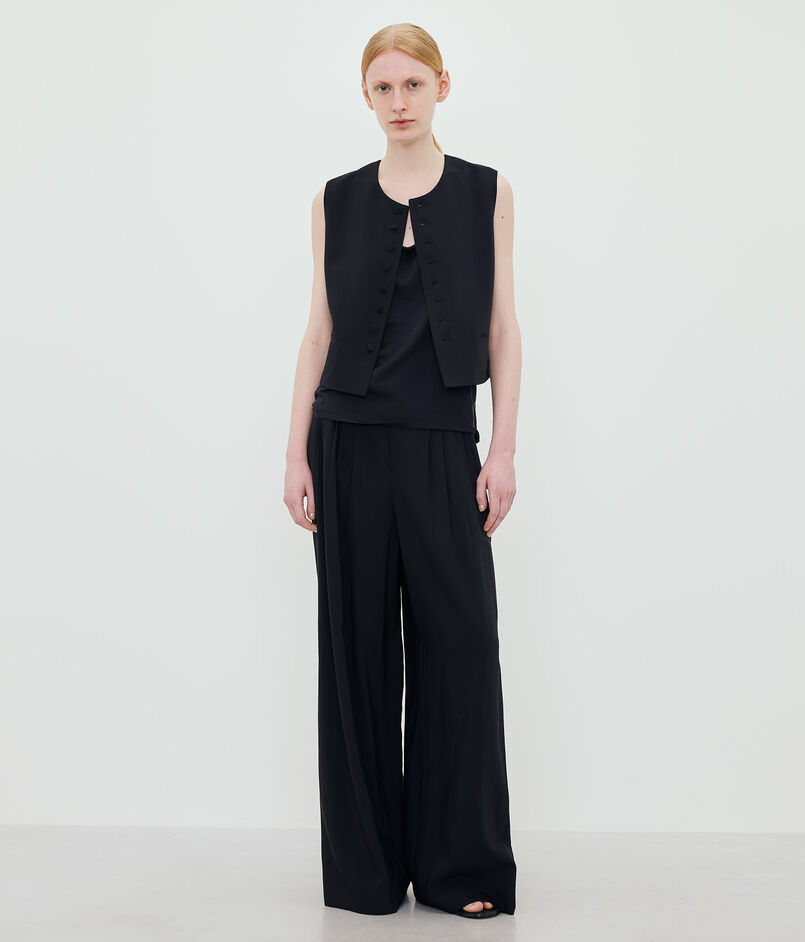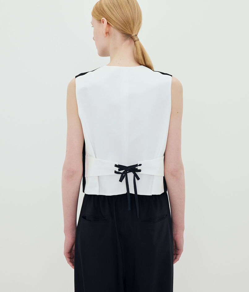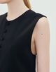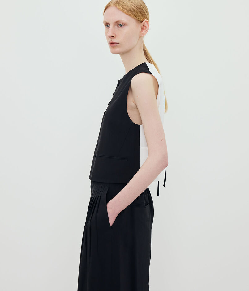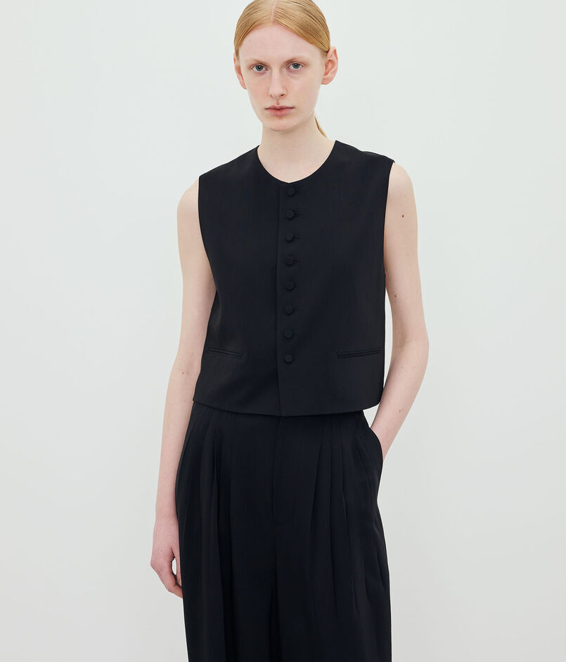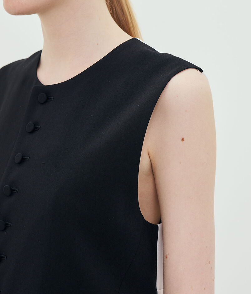 ボタンの間隔をコンパクトなバランスに仕上げたショート丈のジレ。