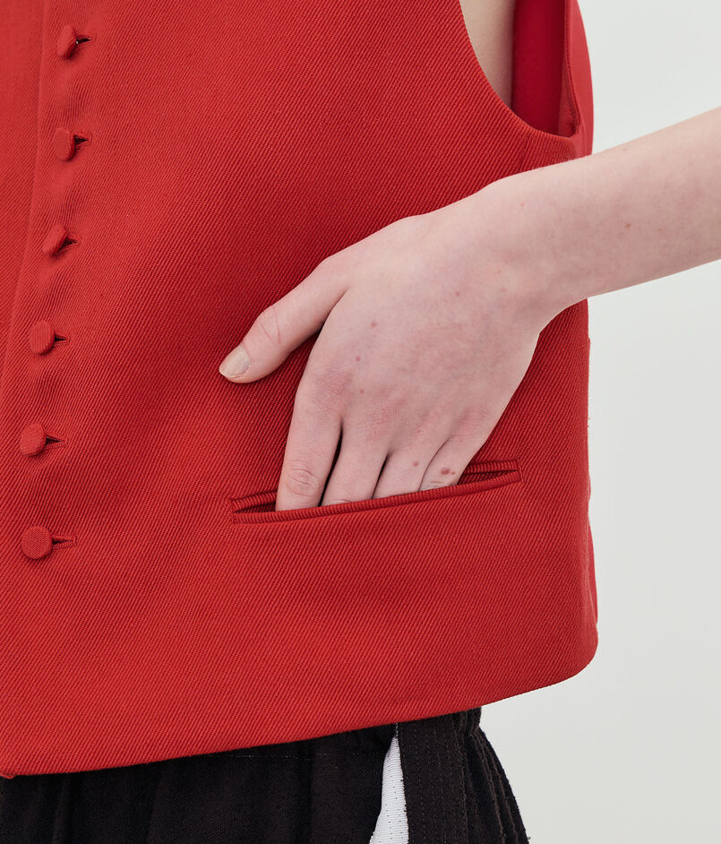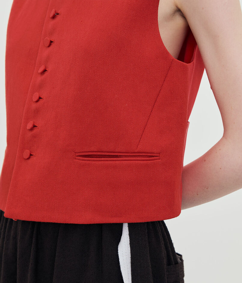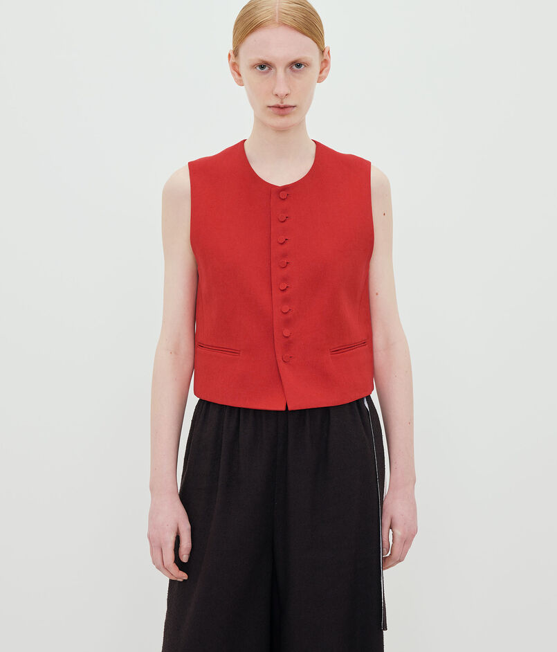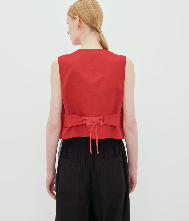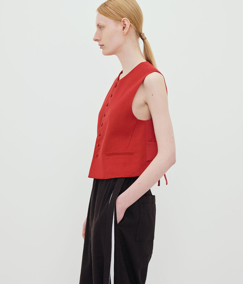 ボタンの間隔をコンパクトなバランスに仕上げたモダンな表情が魅力的なショート丈のジレ。