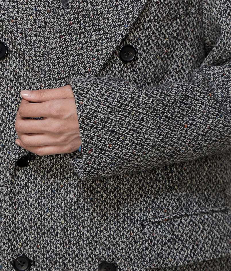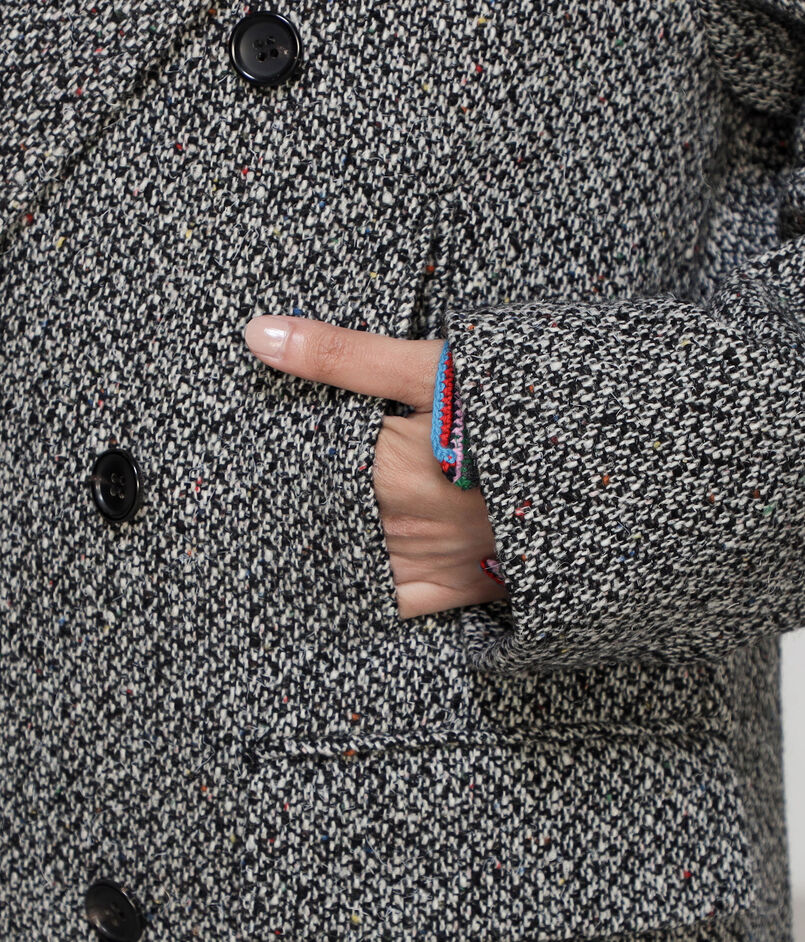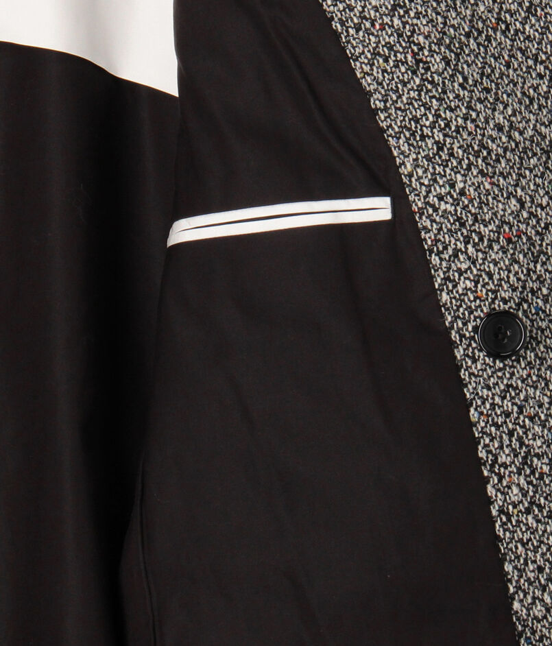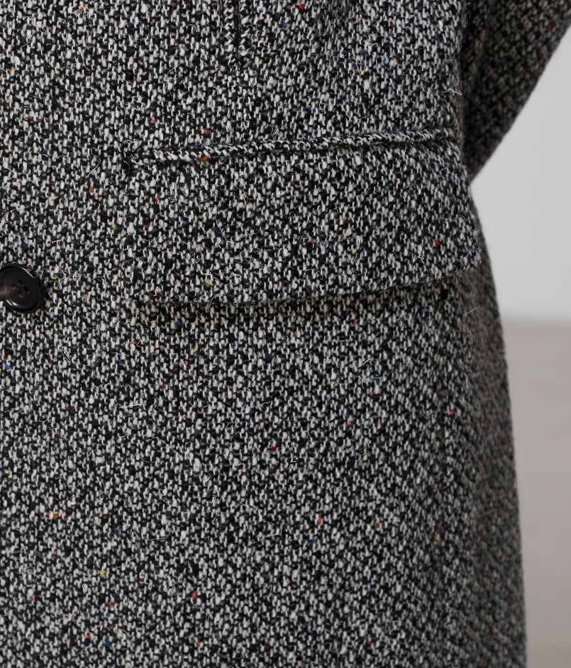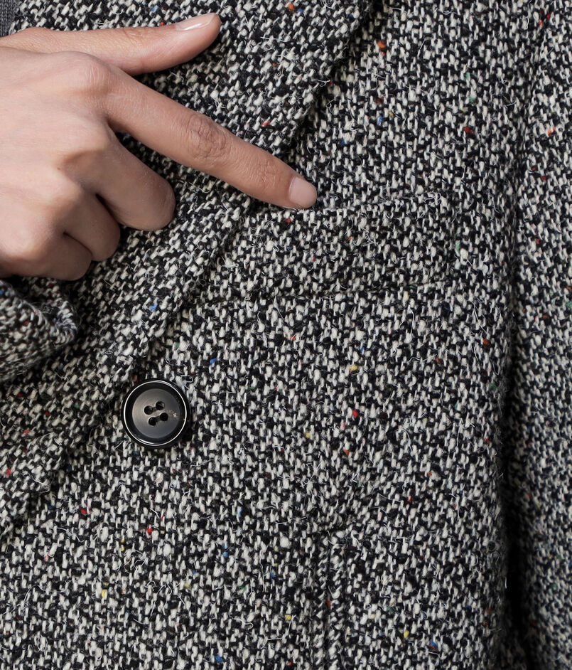 ドライタッチのウール糸でモノトーンに織り込まれた毛足の長いナイロン糸とカラフルなカラーネップが織り込まれ、張りとコシのあるコンパクトでクラシックなイタリア素材です。