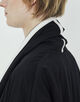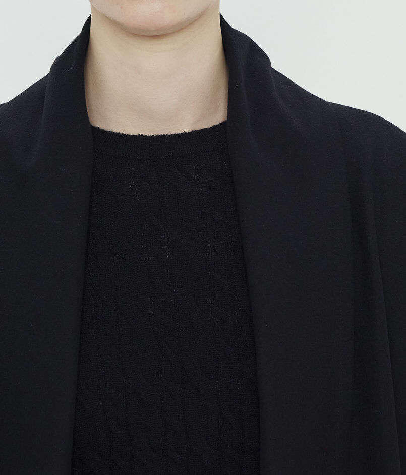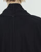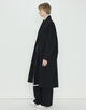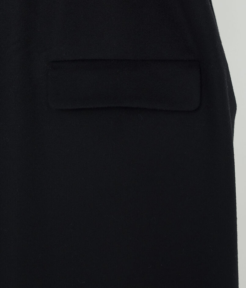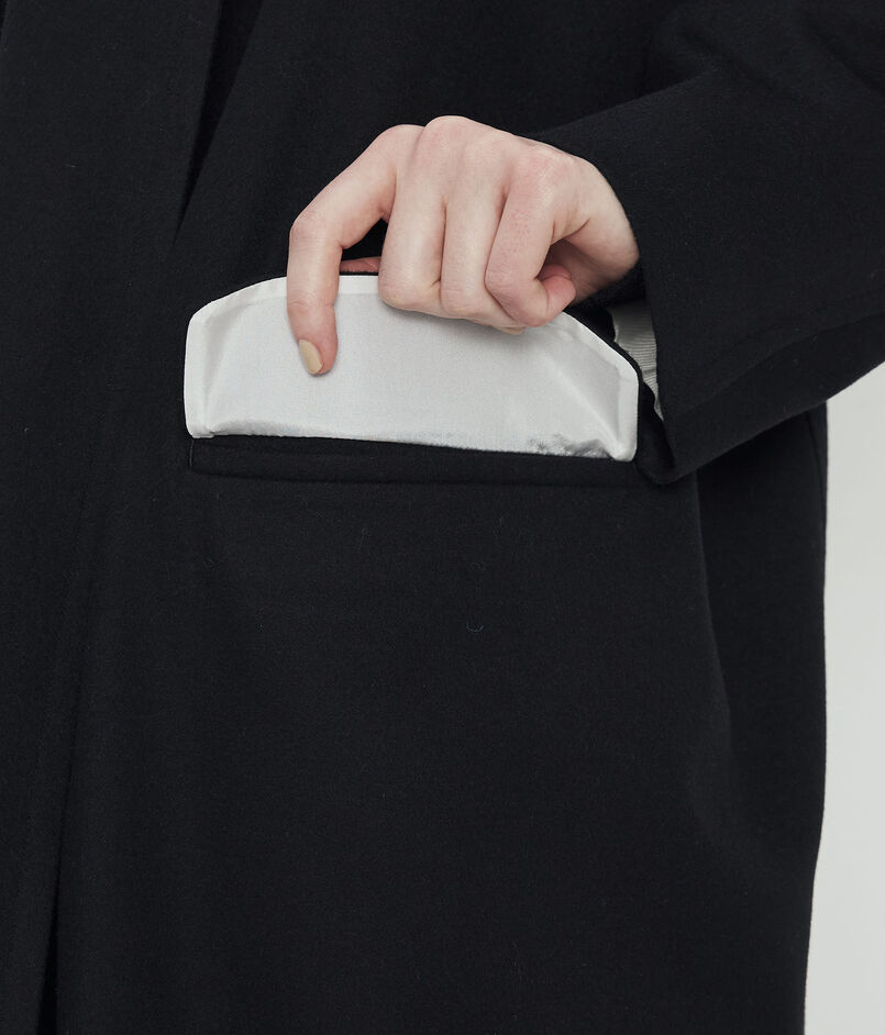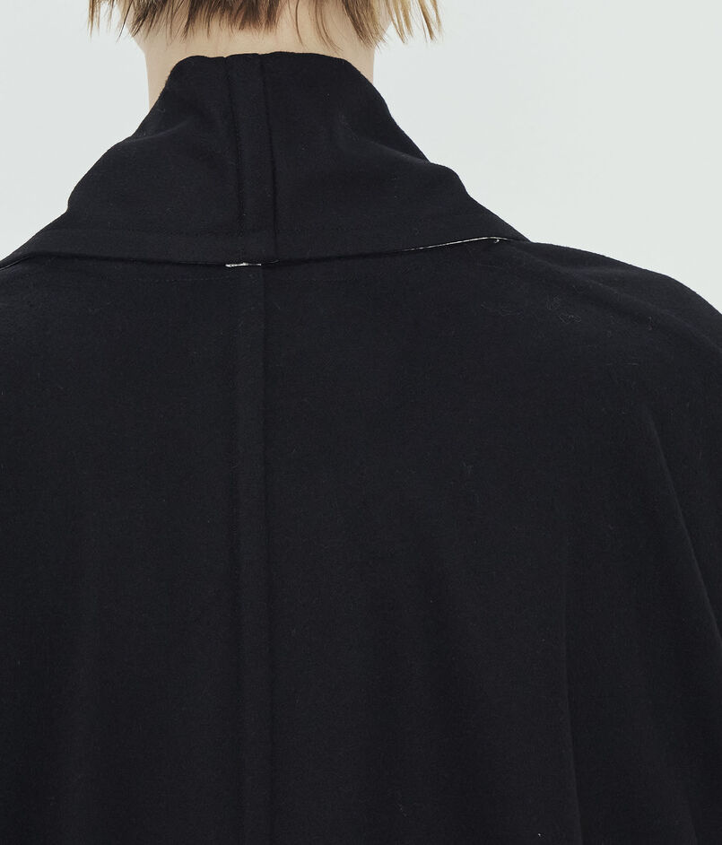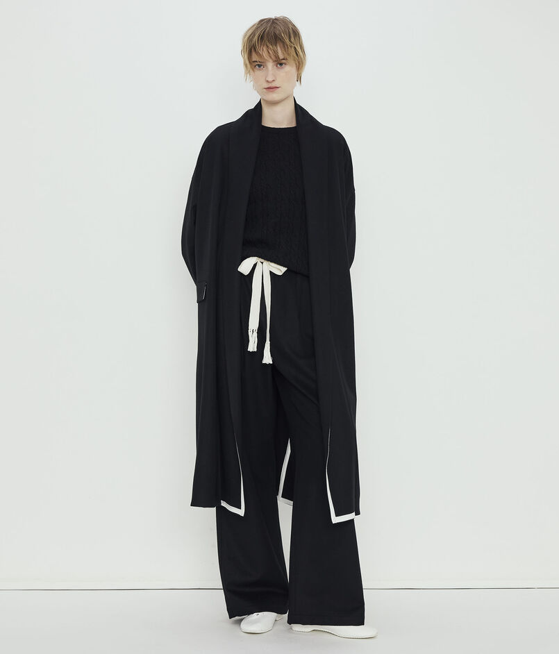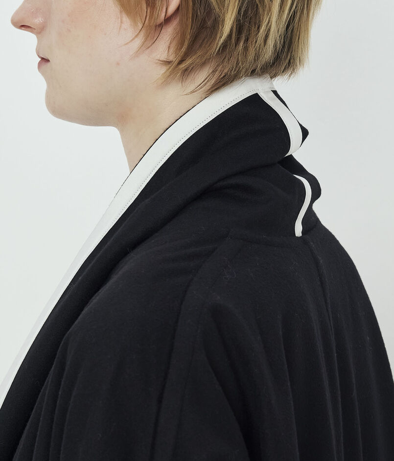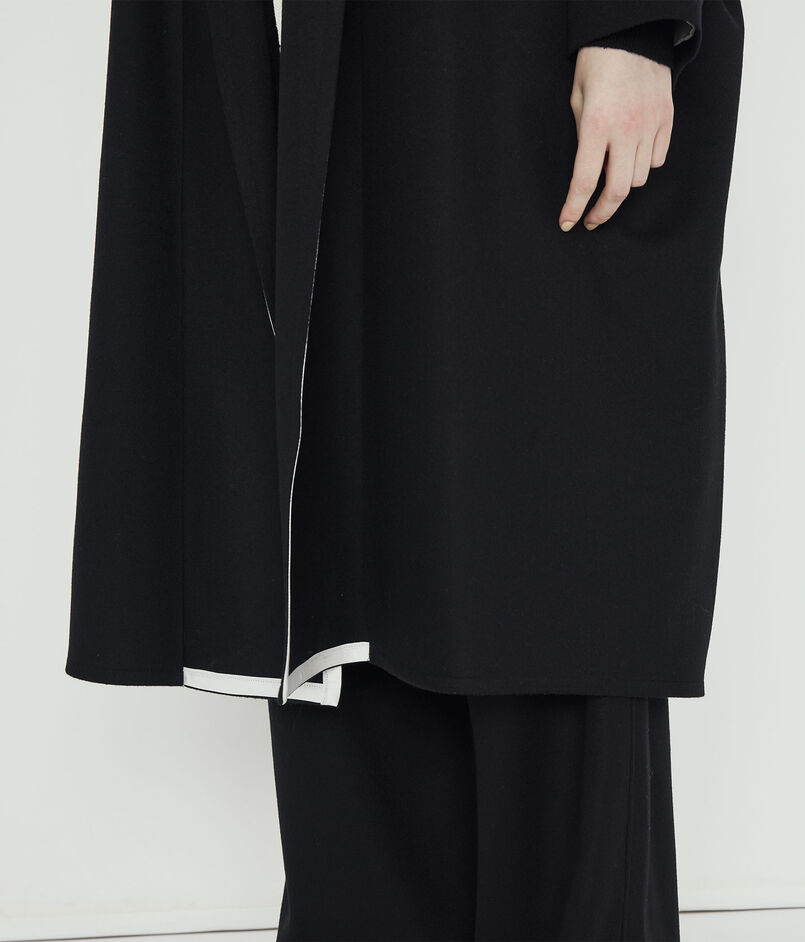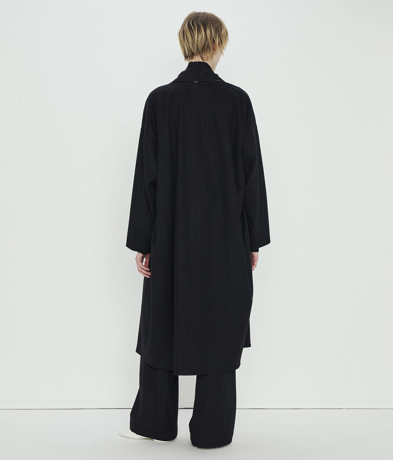 襟腰を高めに設定したショールカラーコートは、裏側のパイピングカラーが上品なアクセントに。
