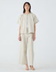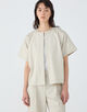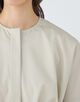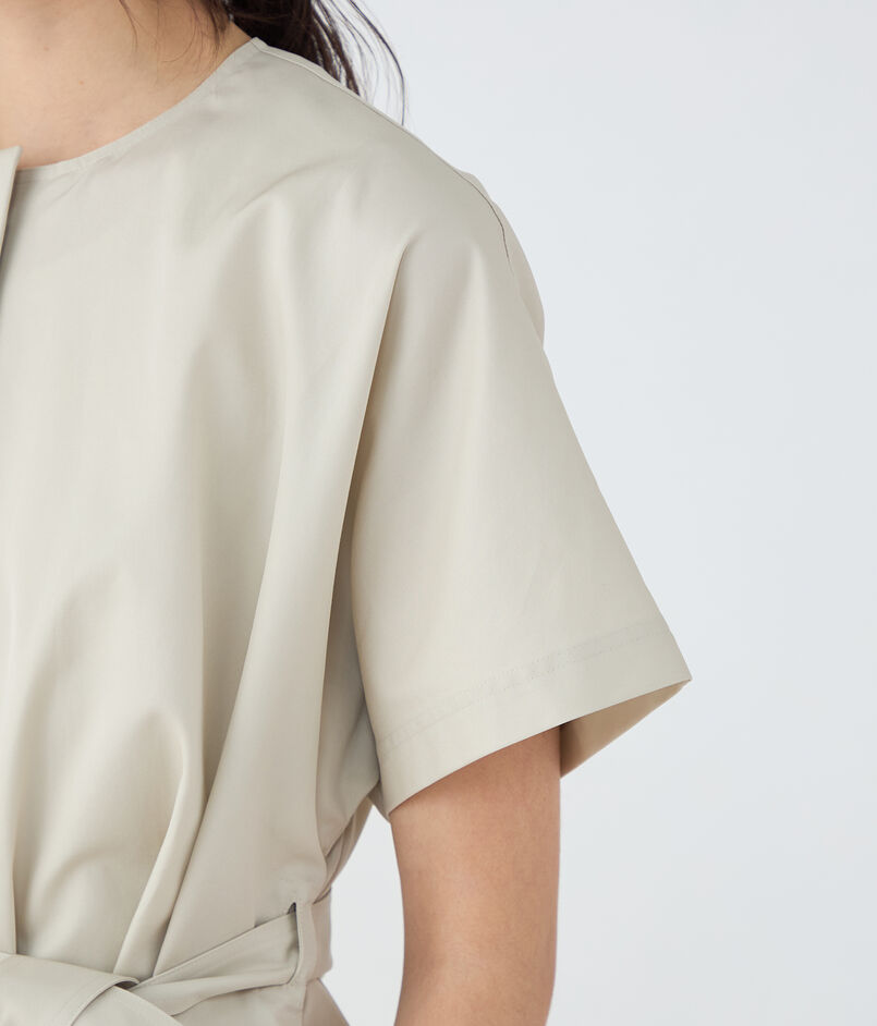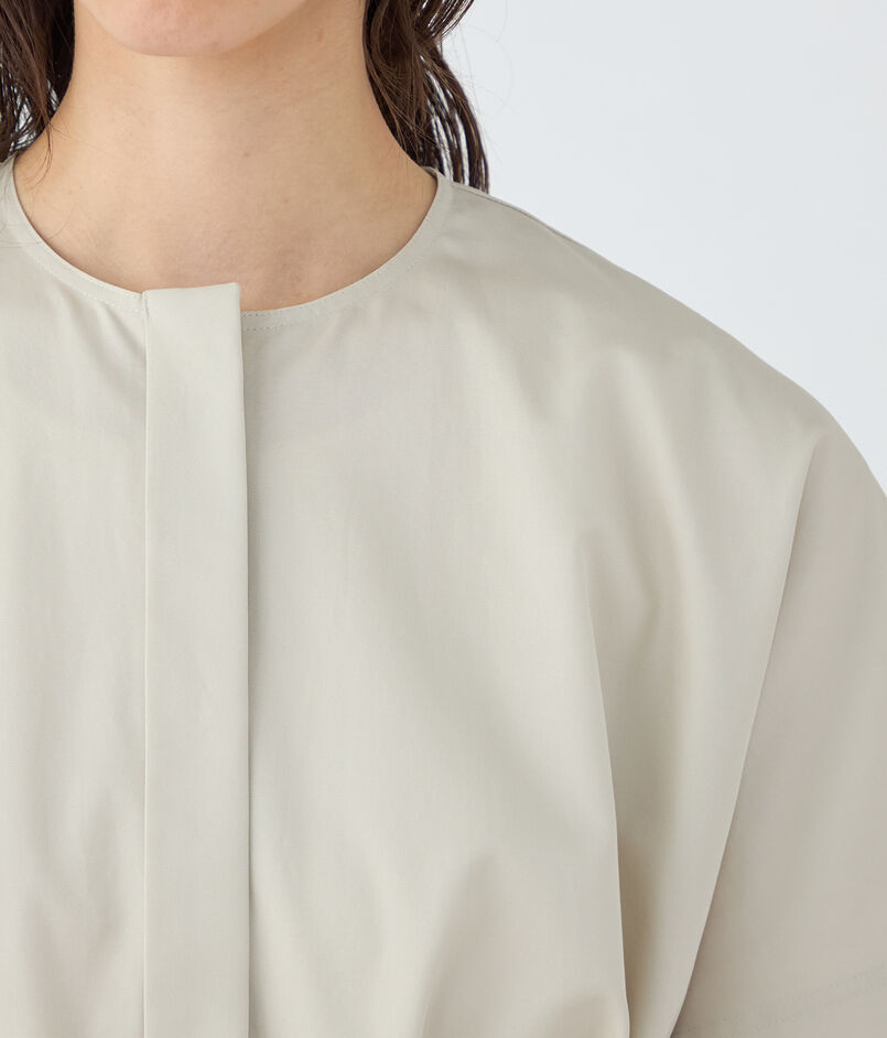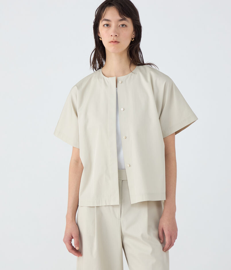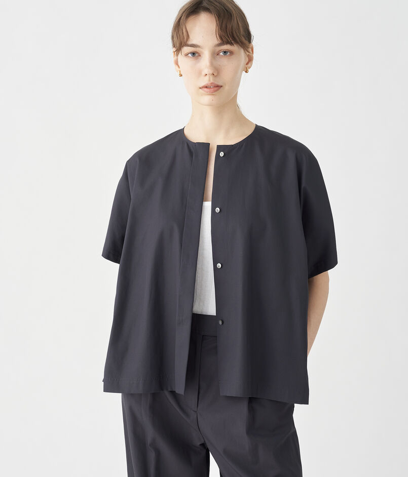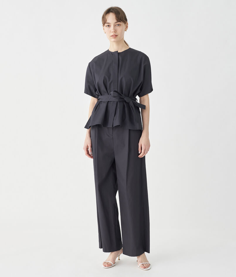 シャツはゆったりとしたシルエットに肩の丸み、ワイドスリーブでリラックス感がありつつも、きゅっと詰まったコンパクトなネックラインでクリーンな印象に。