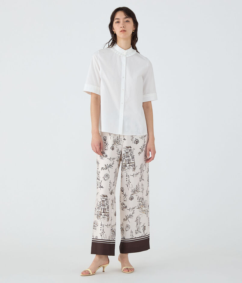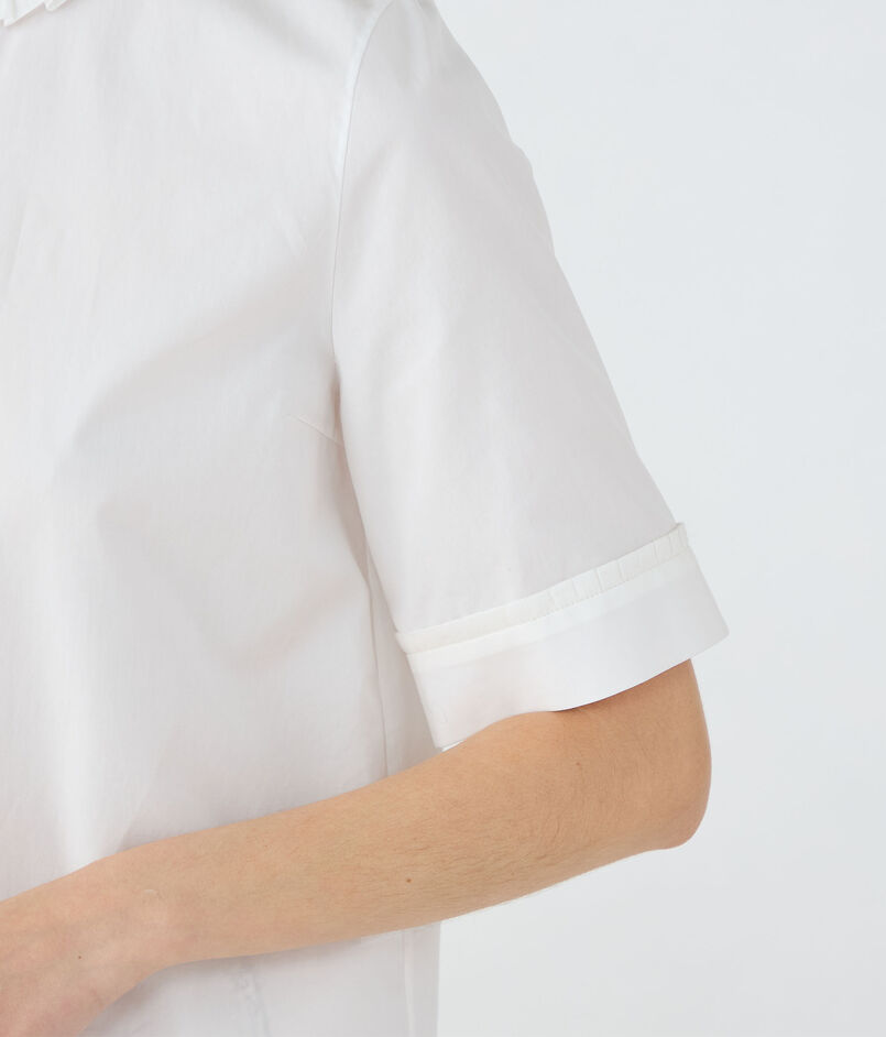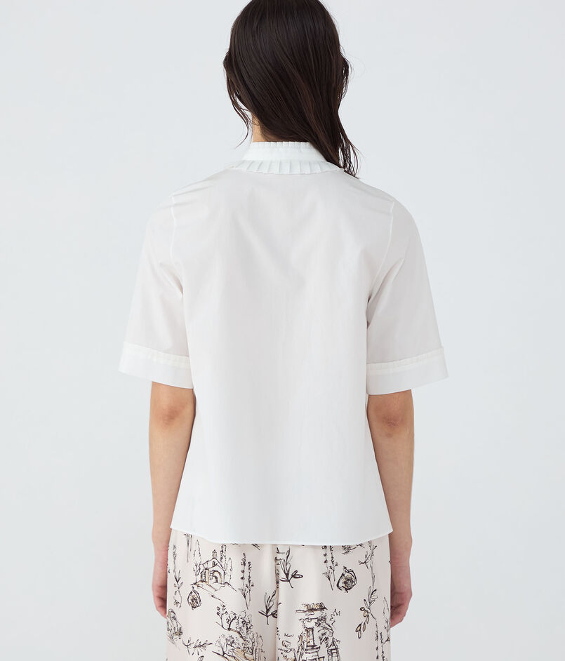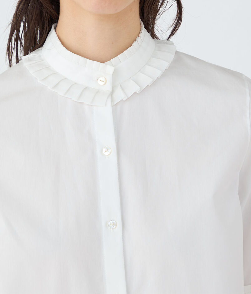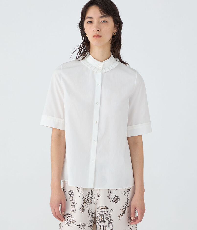 首元に沿うスタンドカラーでクリーンな印象ながら、襟の両端とカフスの上端に海外縫製ならではの繊細なタックリボンをふんだんにあしらい、華やかさとフェミニンさをプラスした一枚。