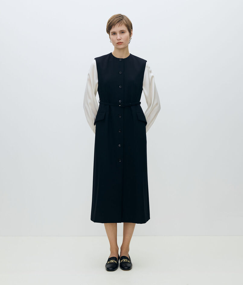 甘くなり過ぎないよう襟ぐりとカフスに多針ステッチを施し、全体の印象を引き締めています。