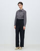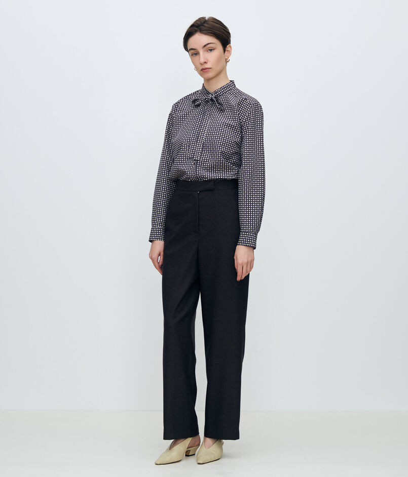 襟ぐりのボウタイはリボン結びするだけでなく、長さを調整して片リボンにしたり、取り外してクルーネックにするなど、気分やスタイリングに合わせて雰囲気を変えて着用いただけます。