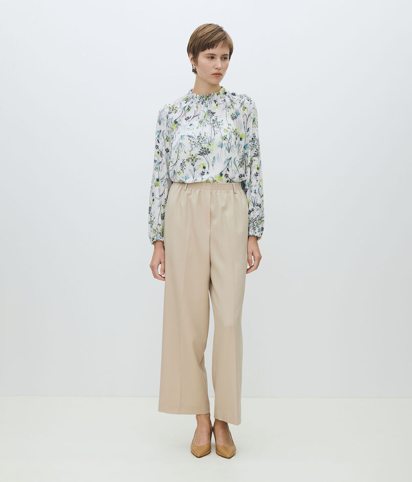 細やかなギャザーを寄せたスタンドネック風デザインで顔まわりに華やかさをプラス。