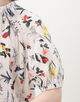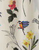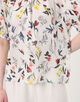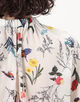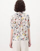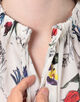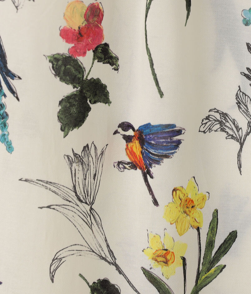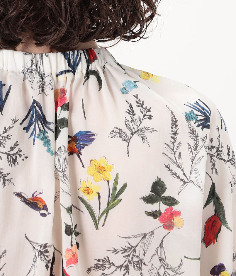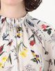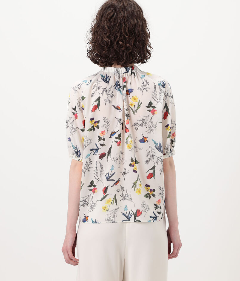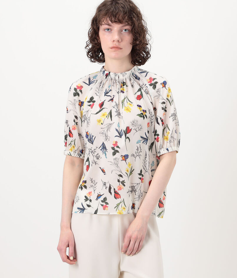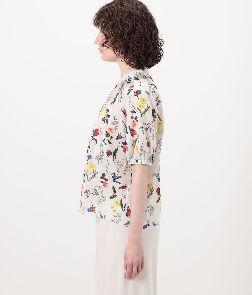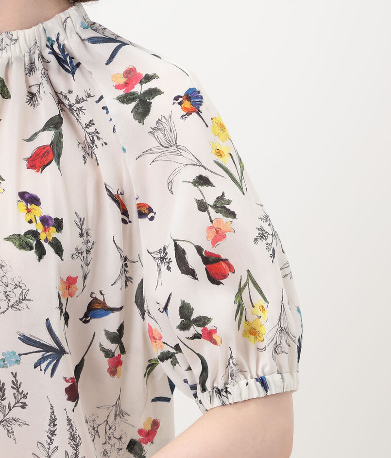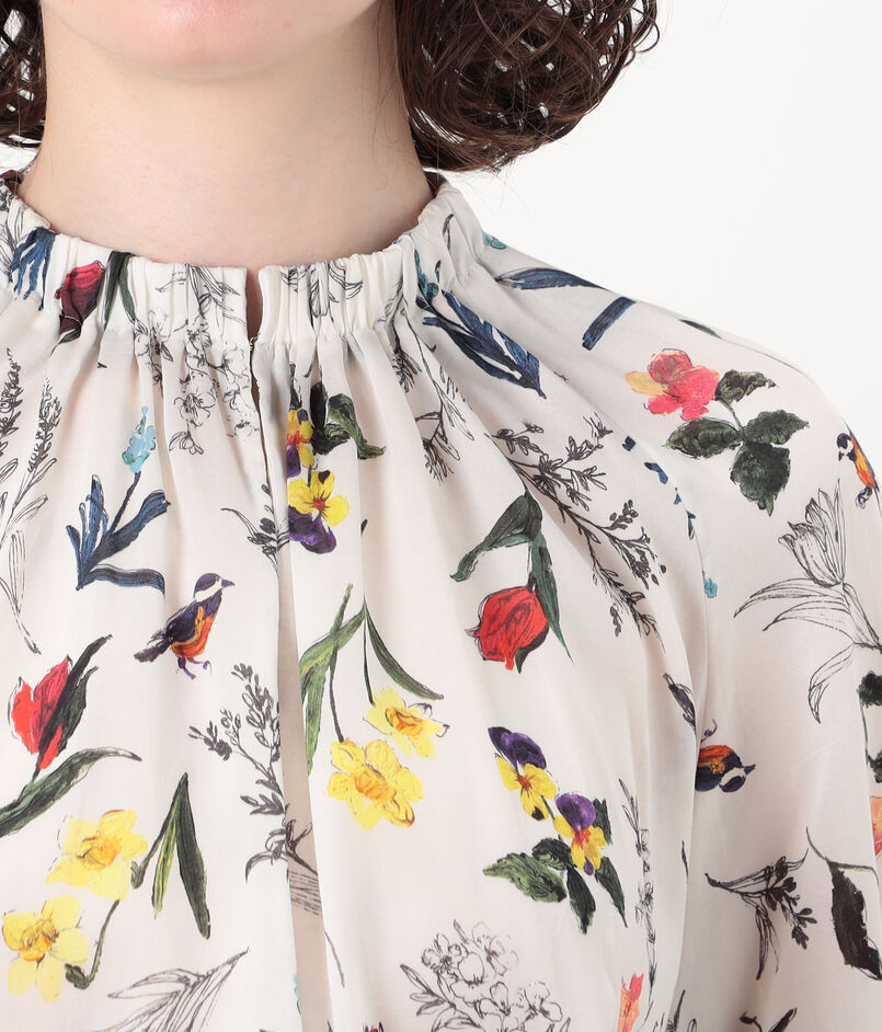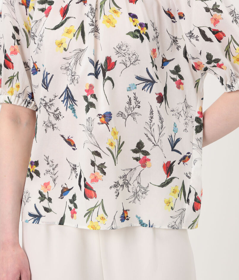 繊細なタッチで描かれた色彩豊かな花や鳥のモチーフが目を惹くプリントブラウス。
