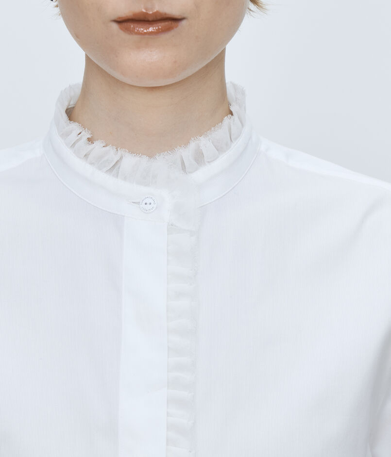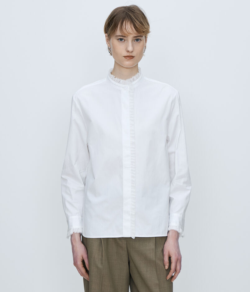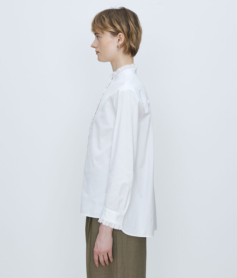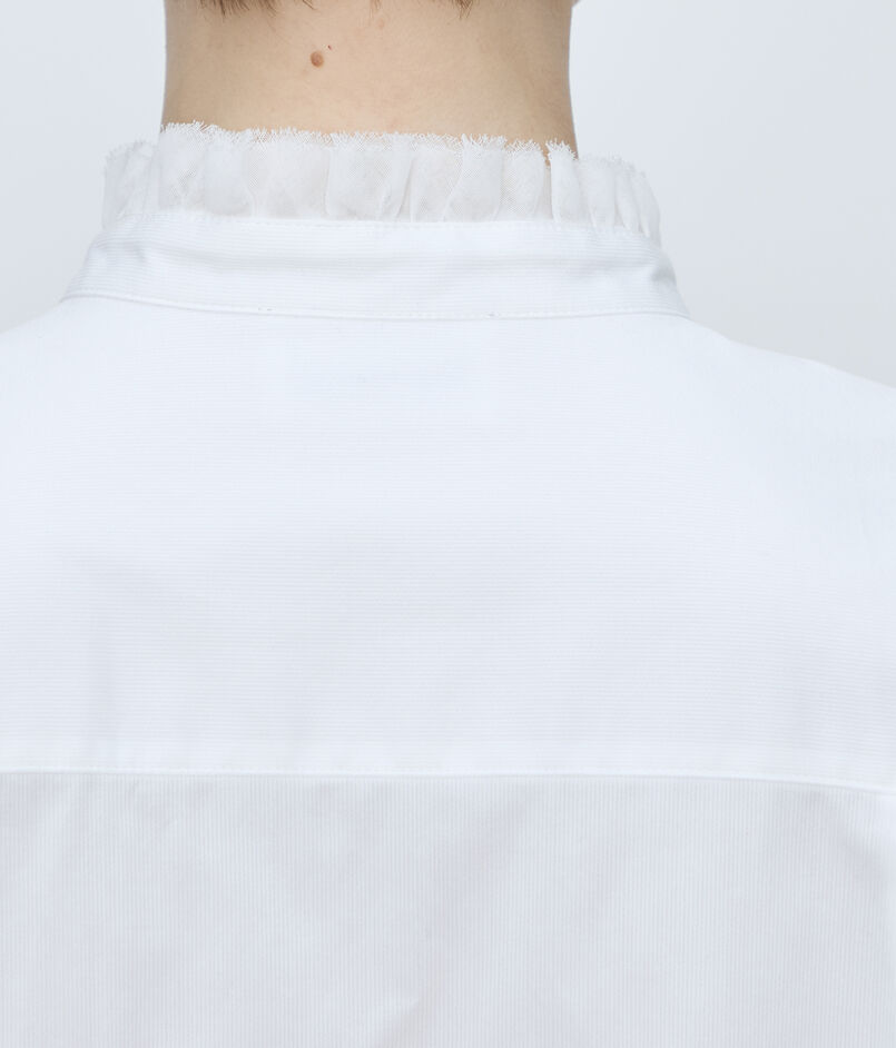 襟まわりと前立て、袖口にオーガンジーのフリルを施した、異素材のコンビ使いが目を惹く〈TOMORROWLAND collection〉ならではの一着です。