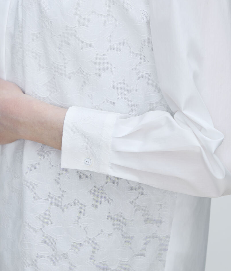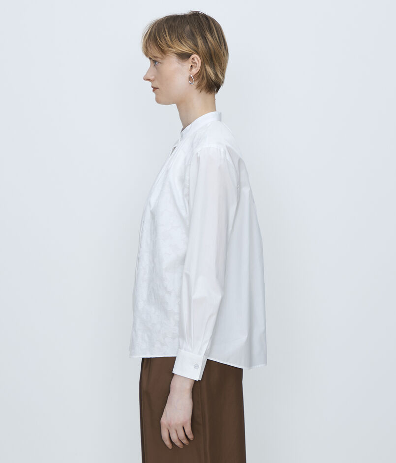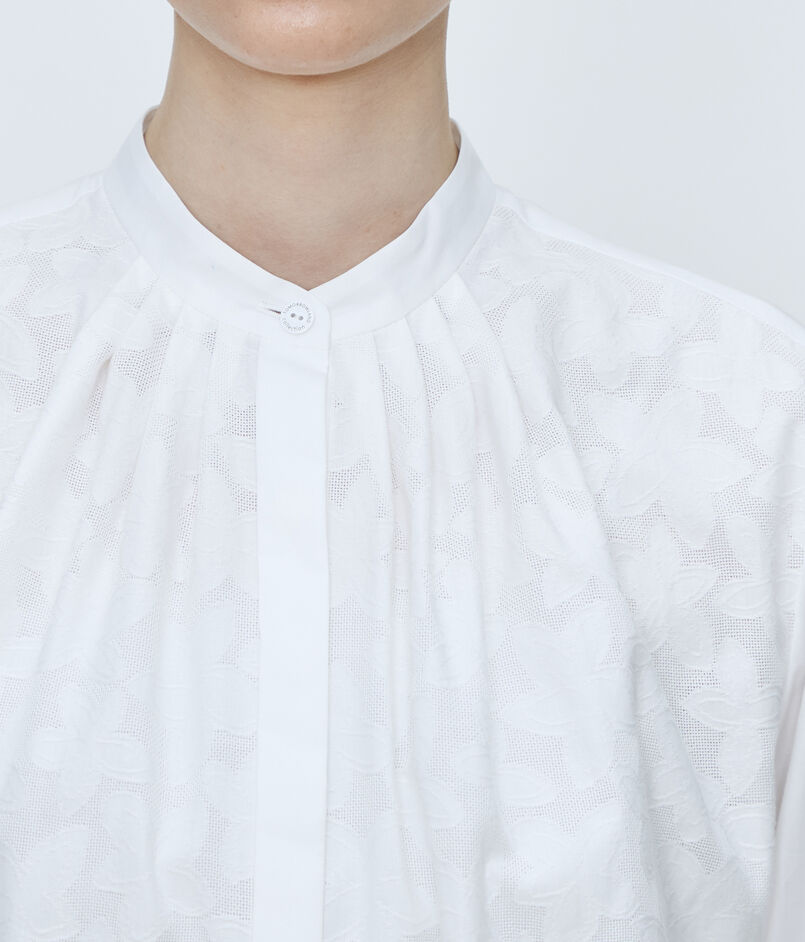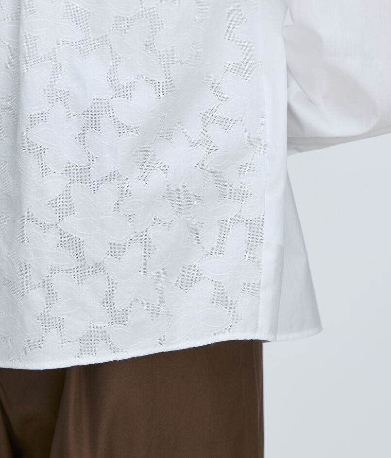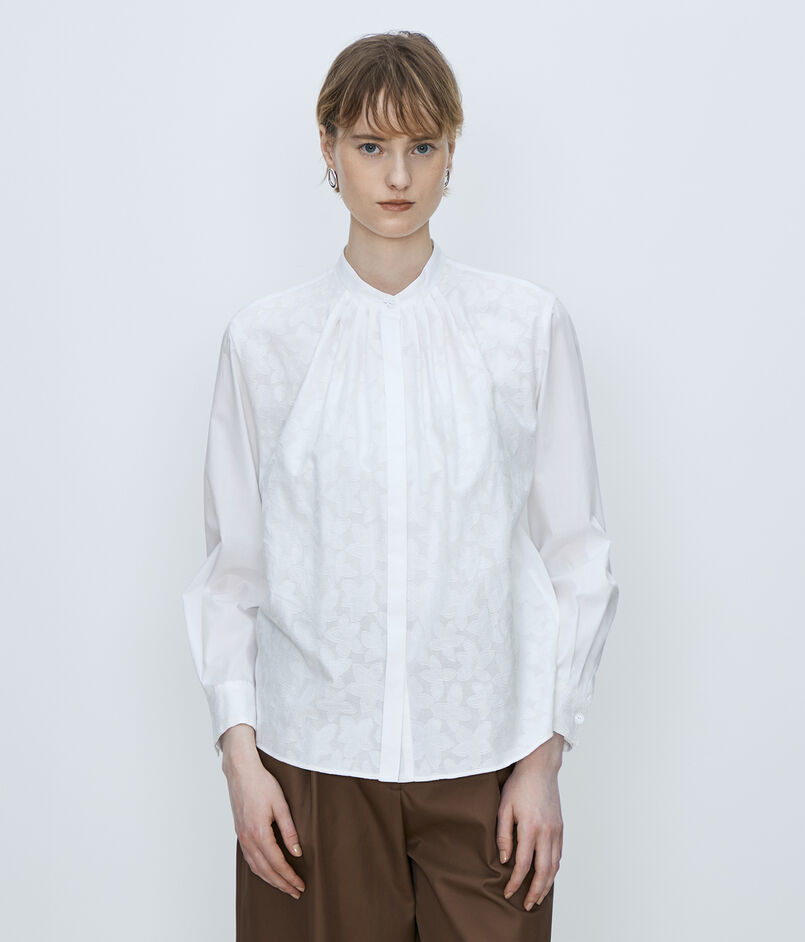 表面に繊細な表情のあるカラミ組織と縁取りされた花柄を組み合わせた〈TOMORROWLND collection〉オリジナルのカラミジャカード素材を使用したブラウス。