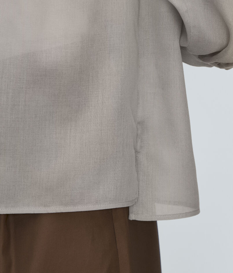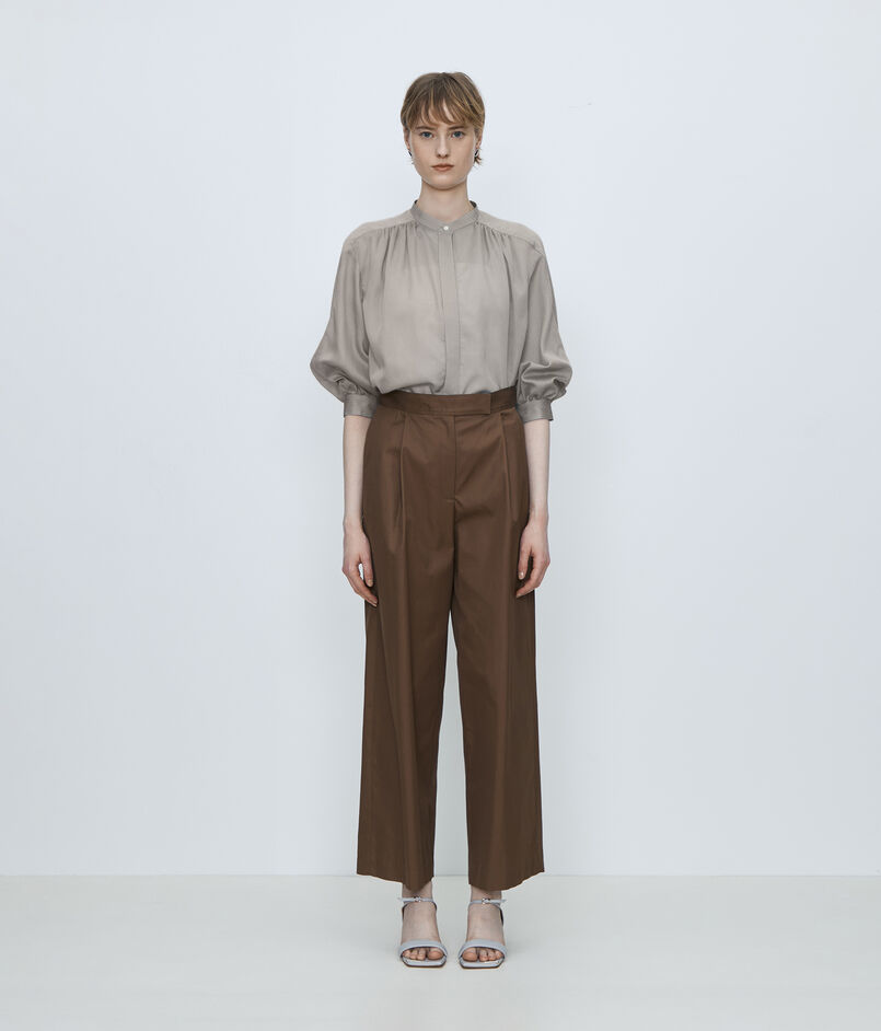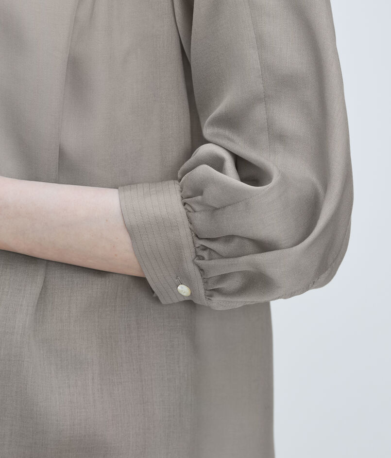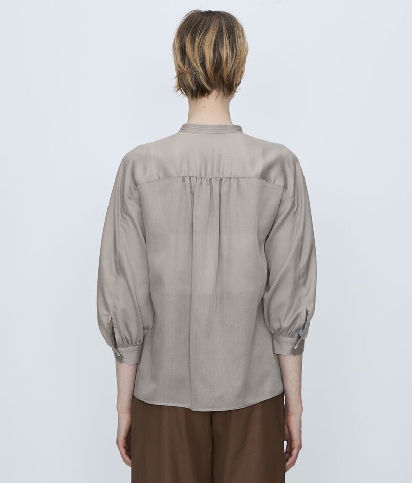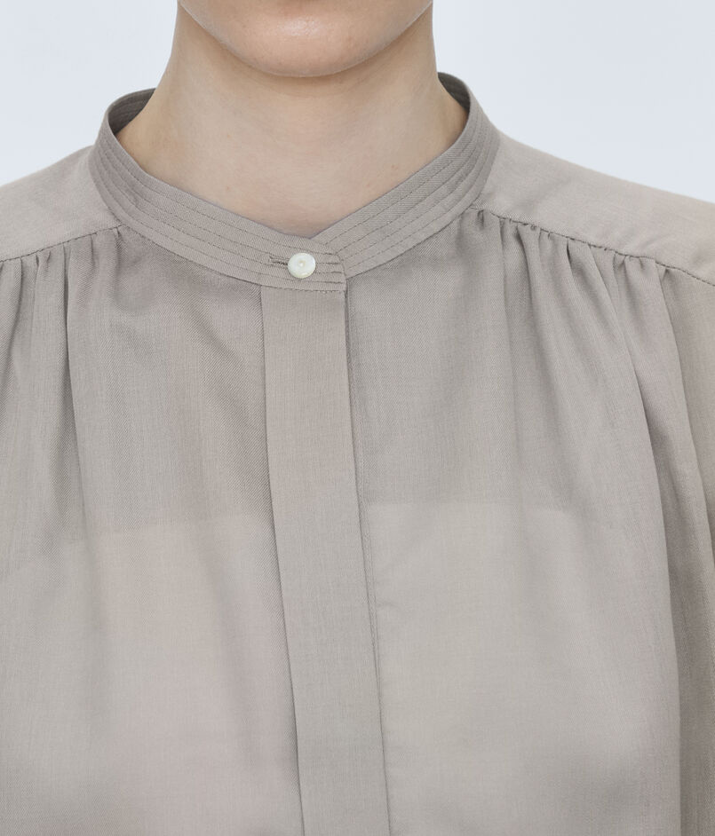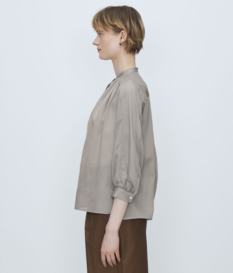 ギャザーブラウスは襟ぐりと袖口、バックヨークに寄せたギャザーが生み出すふんわりとしたフォルムで柔らかな女性らしい印象の一着。