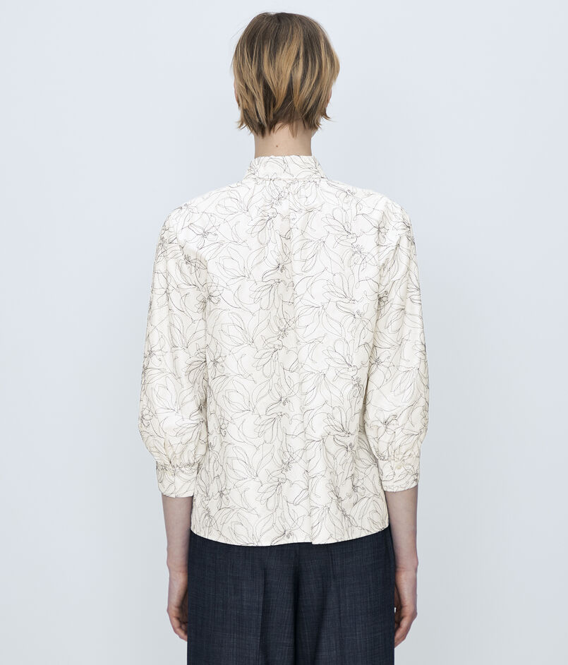 上品なツヤのあるタフタ素材に、ネイビーの糸でハンドタッチのフラワーモチーフをネ刺繍したブラウス。