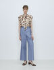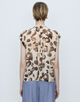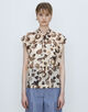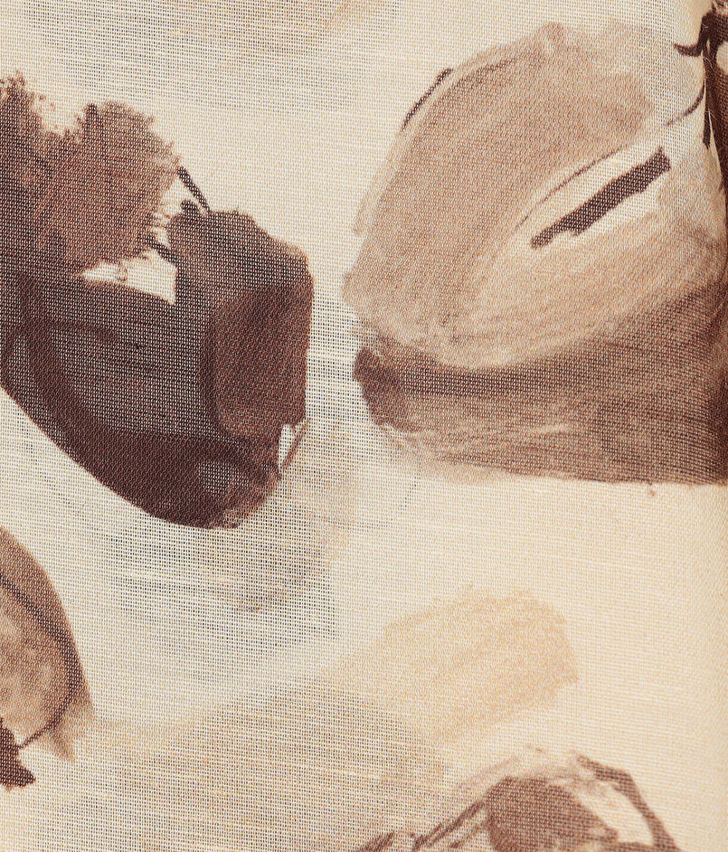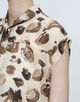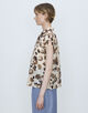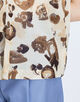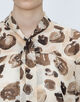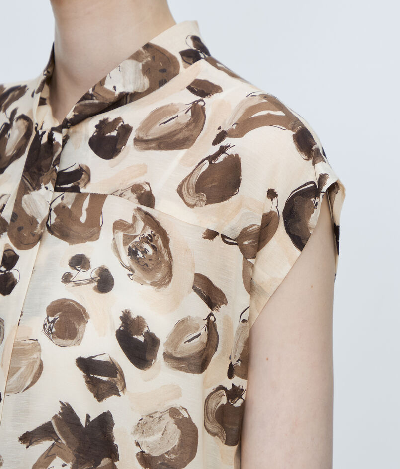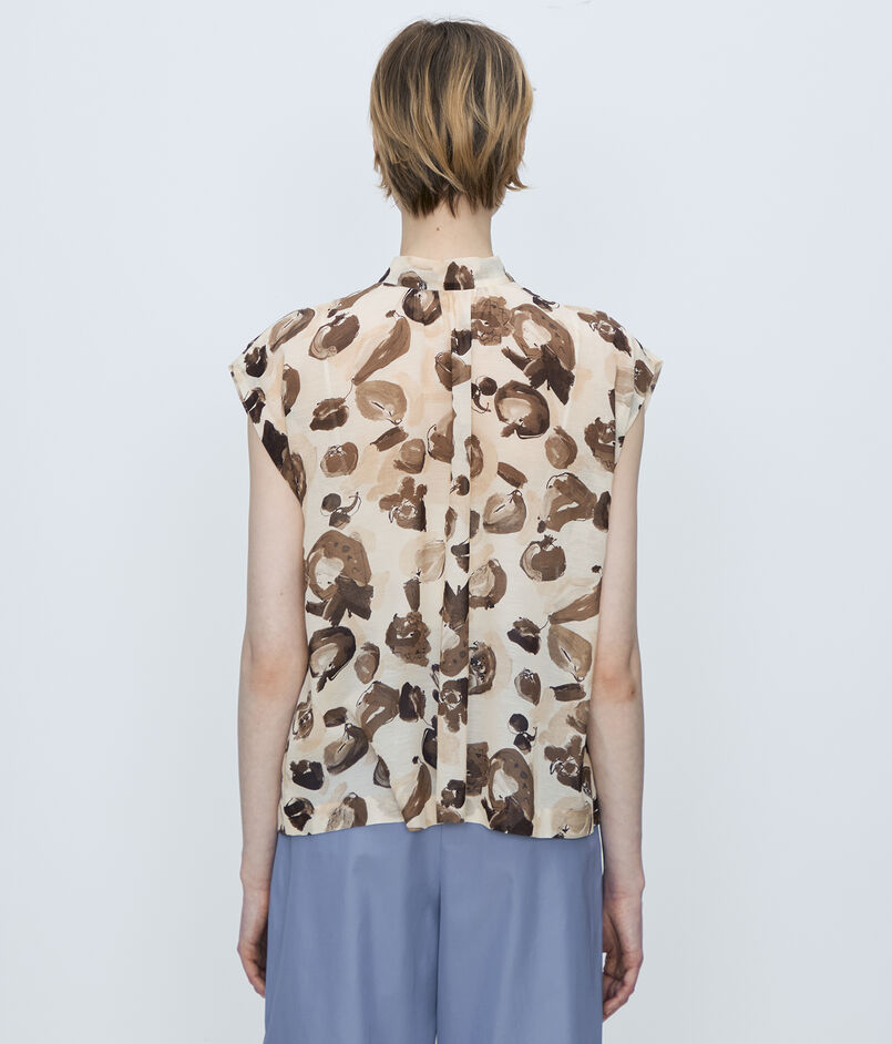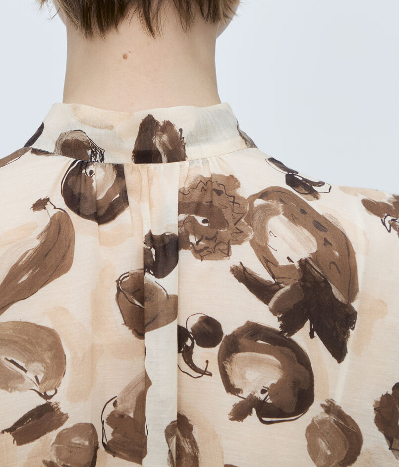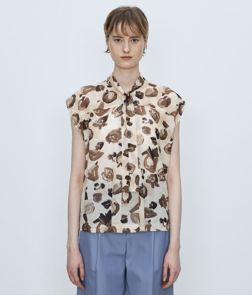 フルーツや花のようなモチーフをみずみずしく、筆のタッチを活かして力強く描いたプリントブラウス。