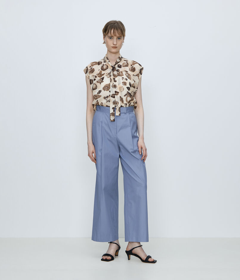 ボクシーなシルエットでリラックス感がありつつも、首元に配したボウタイでクラシカルな印象の一枚。