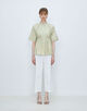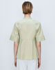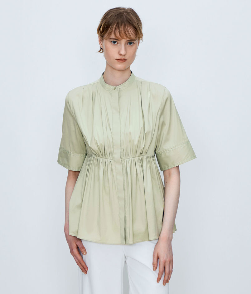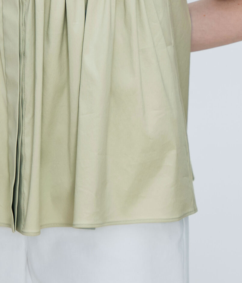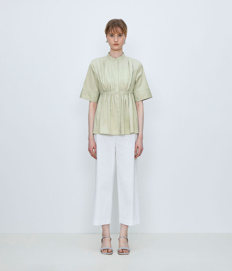 繊細なピンタックによってボリュームを出したブラウスはクリーンな印象で、ペプラムシルエットながらほど良く甘さをおさえた一着。