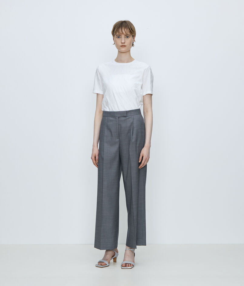 シルケット糸を使用することでジャージならではのリラックス感がありながら、布帛のようなシャープさとナチュラルな光沢を表現しました。