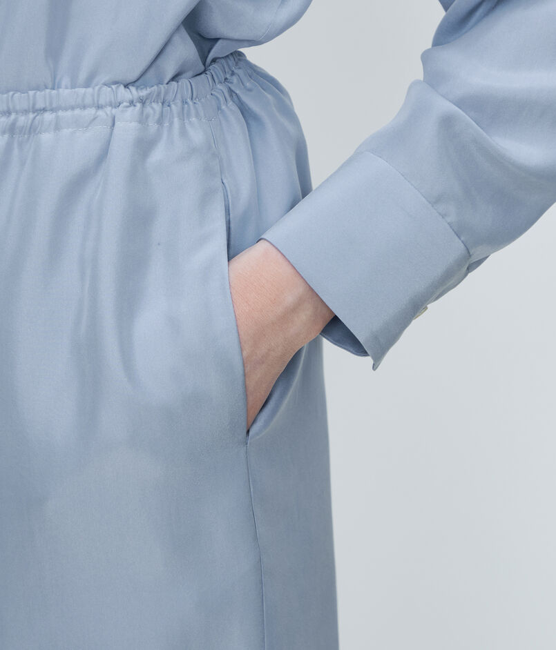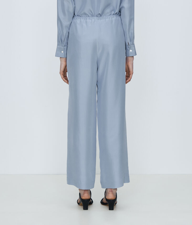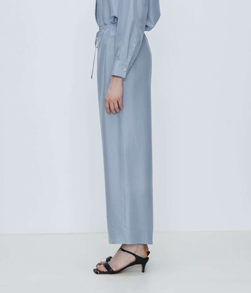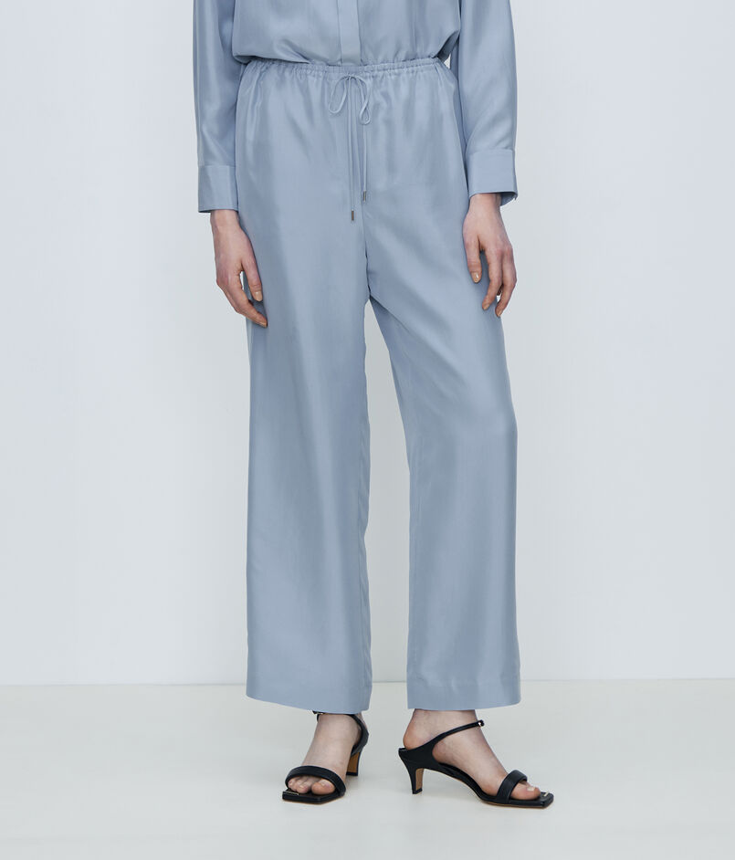 柔らかさを感じるナチュラルな光沢がクリーンな印象のシルク100%のパンツ。