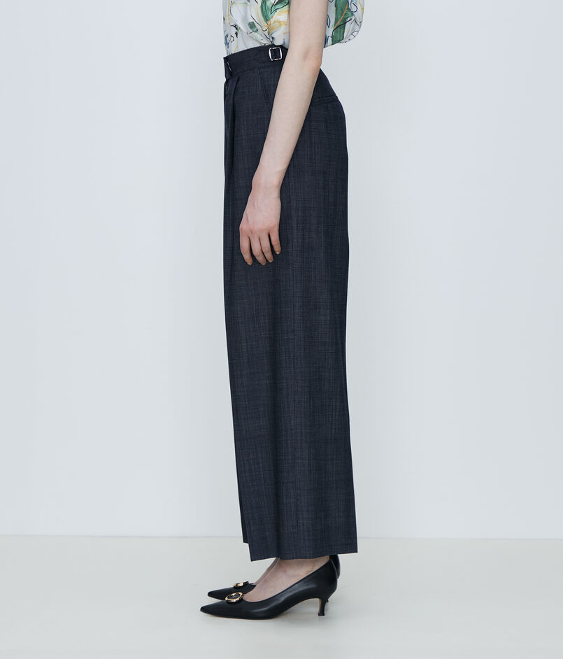 ウールとレーヨンの交織で表現したデニム調の素材を使用したパンツ。