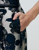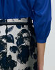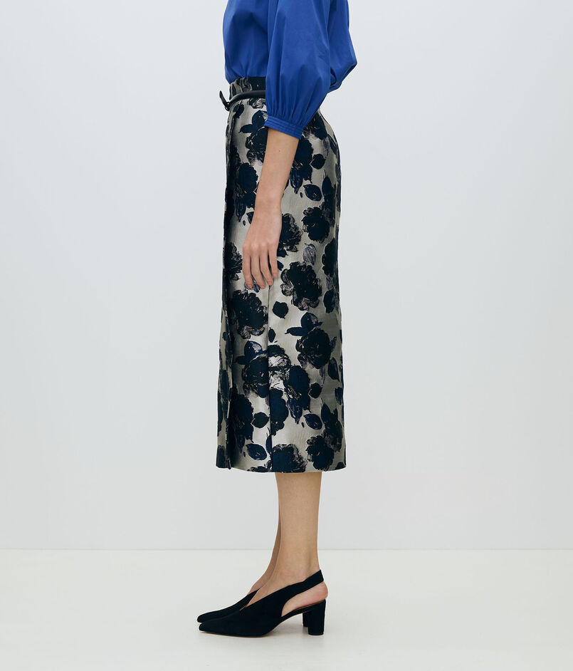 シルバーベースにブルーの大胆なフワラーモチーフが目を惹く、イタリア製の上質なジャカード素材を使用したスカート。