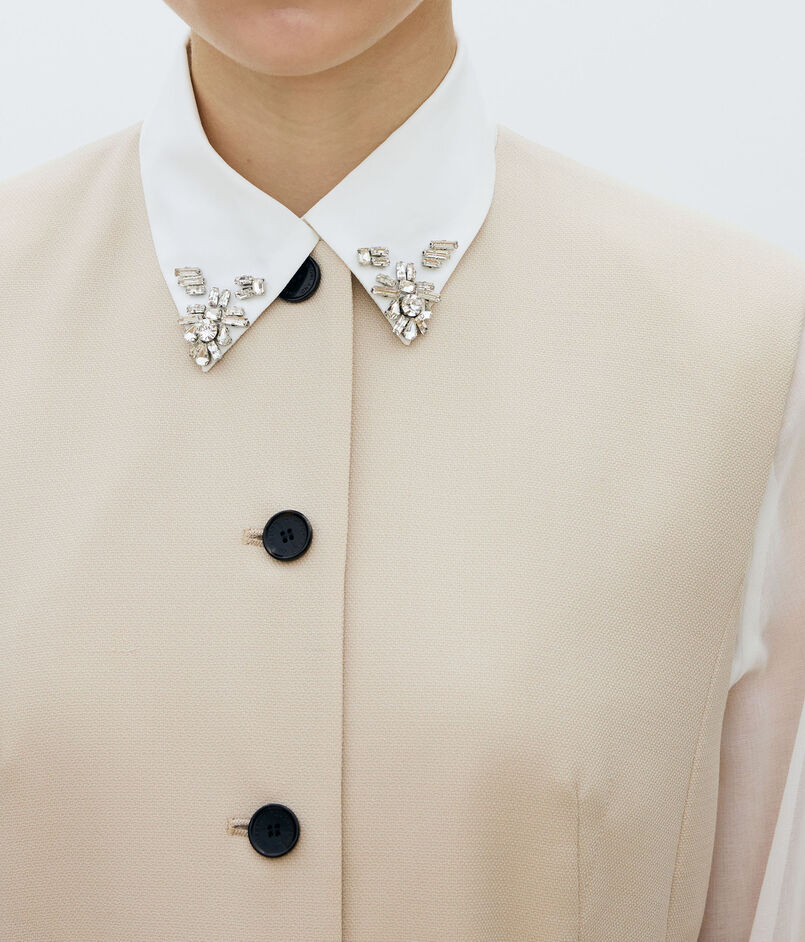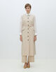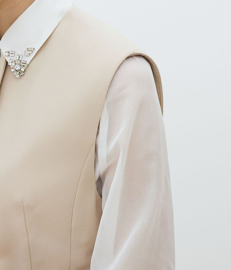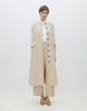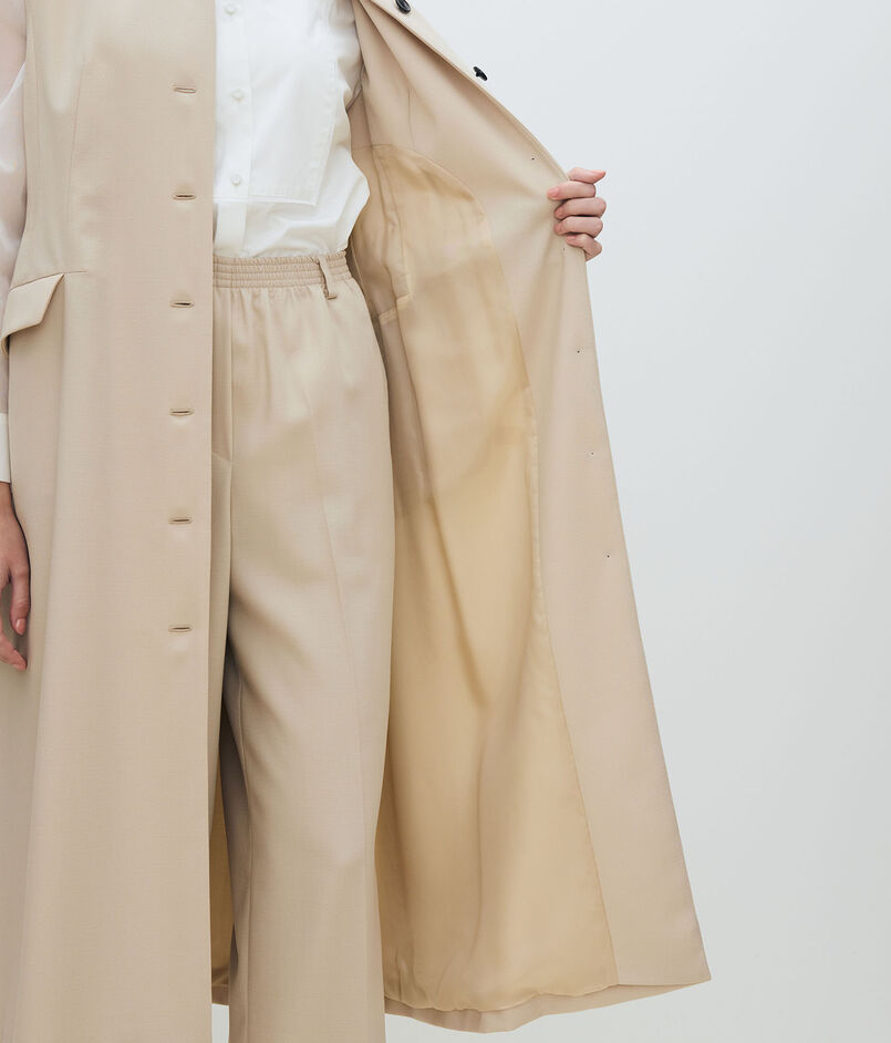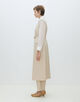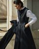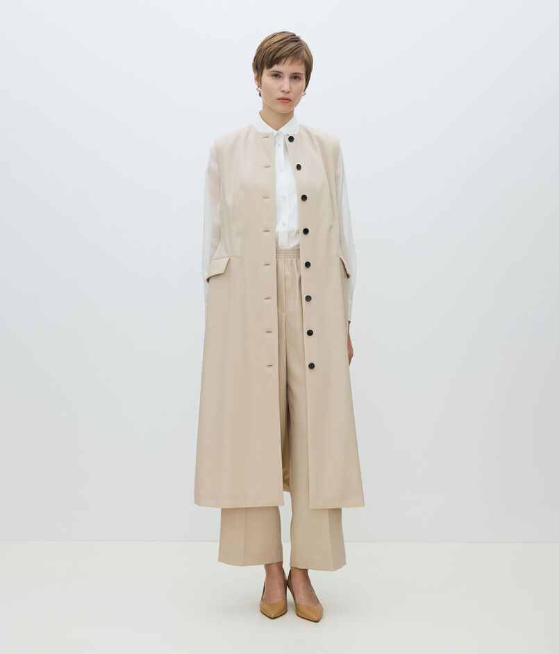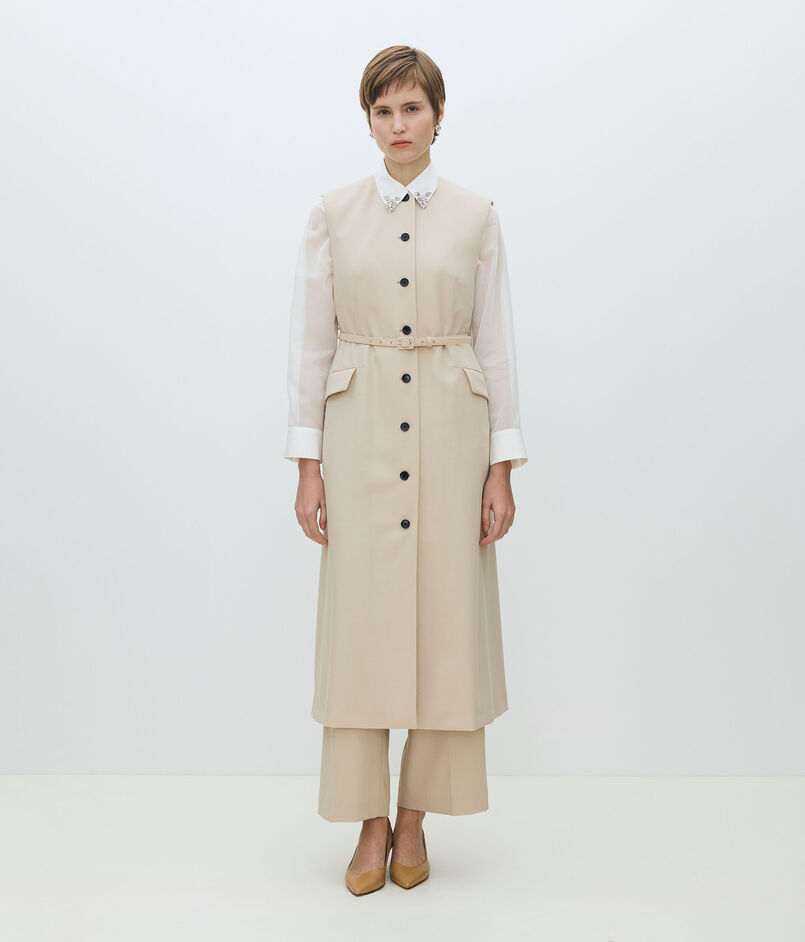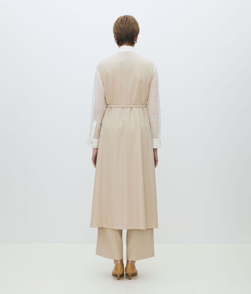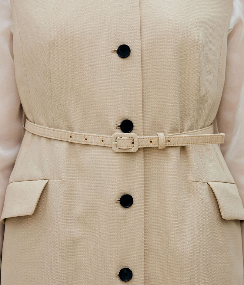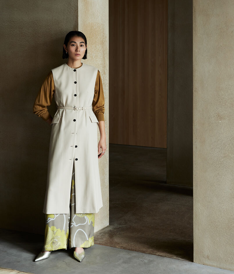 共地のベルトできゅっとウエストマークしたり、フロントを開けてロングジレ感覚で着こなすなど、さまざまなスタイリングをお楽しみいただけます。
