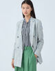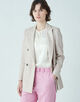 甘くファンシーな素材感にマニッシュなダブルブレストのデザインや縦長のVあきのデザインでシャープさをプラスした一着。