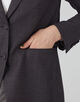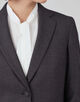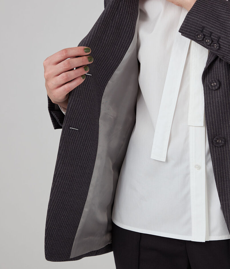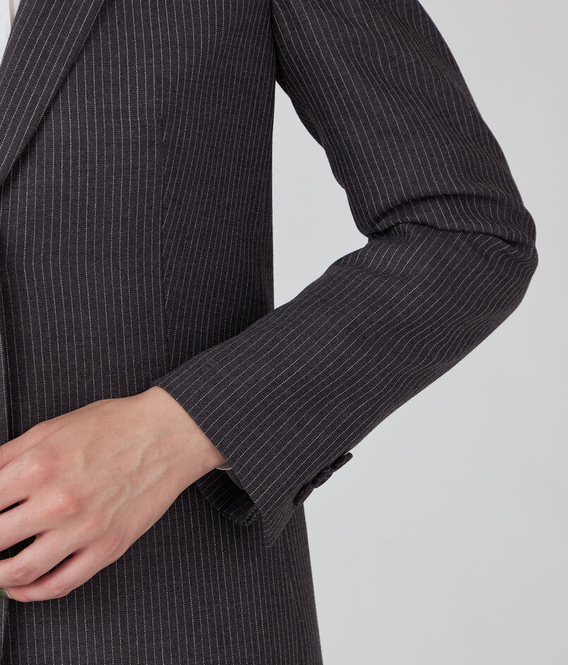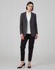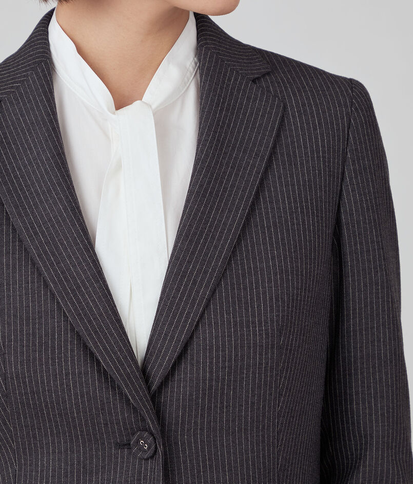 ジャケットは肩から袖山にかけて盛り上がりのないナチュラルショルダーで、すっきりとしたシルエットの一着。