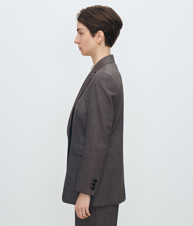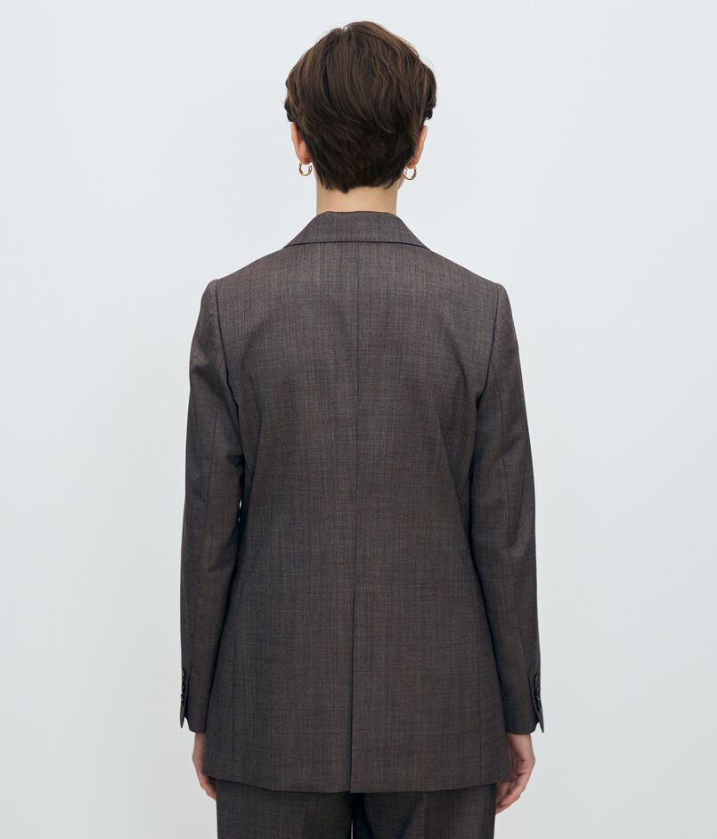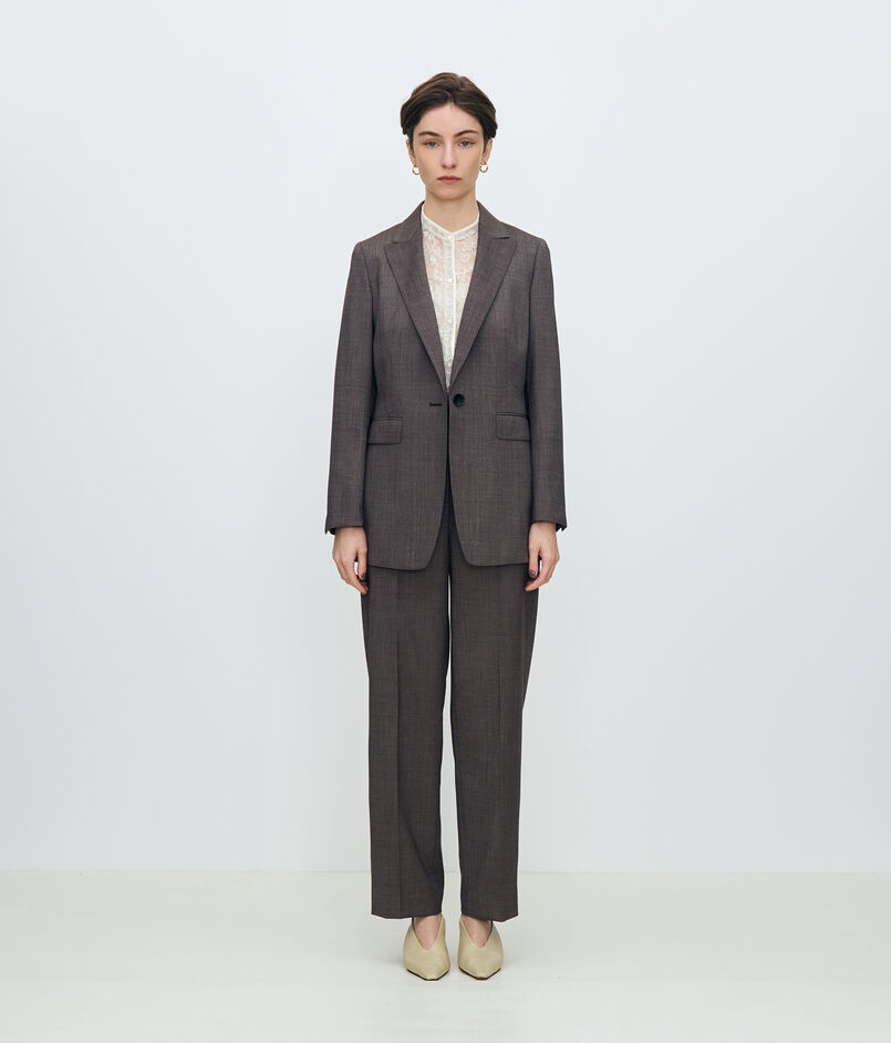 カルゼ生地を先染めすることで生まれるメランジ感が特徴の、マニッシュな印象のストレッチウール素材を使用したセットアップシリーズ。