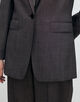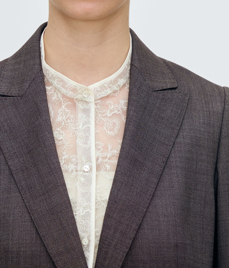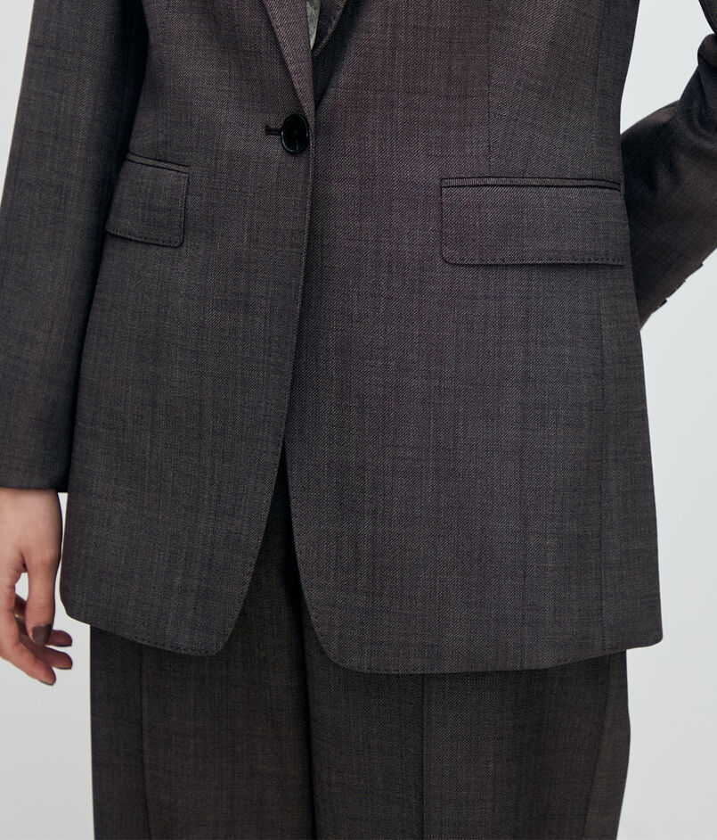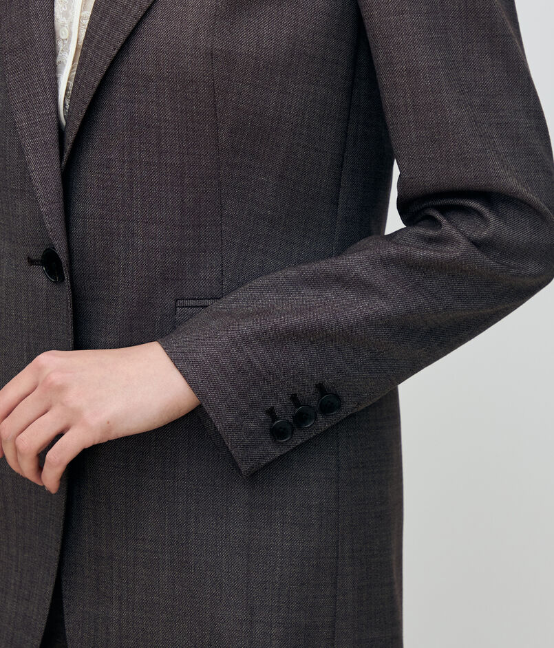 ジャケットはスリムなラペルと一つボタンでシャープな印象に仕上げました。