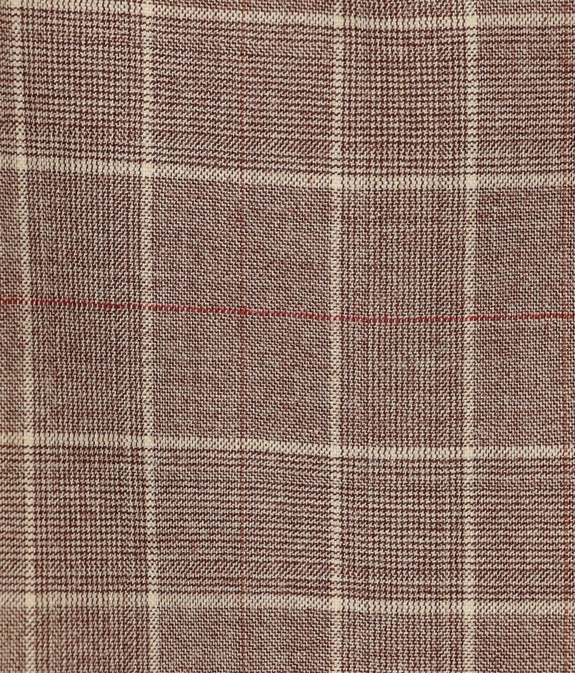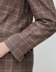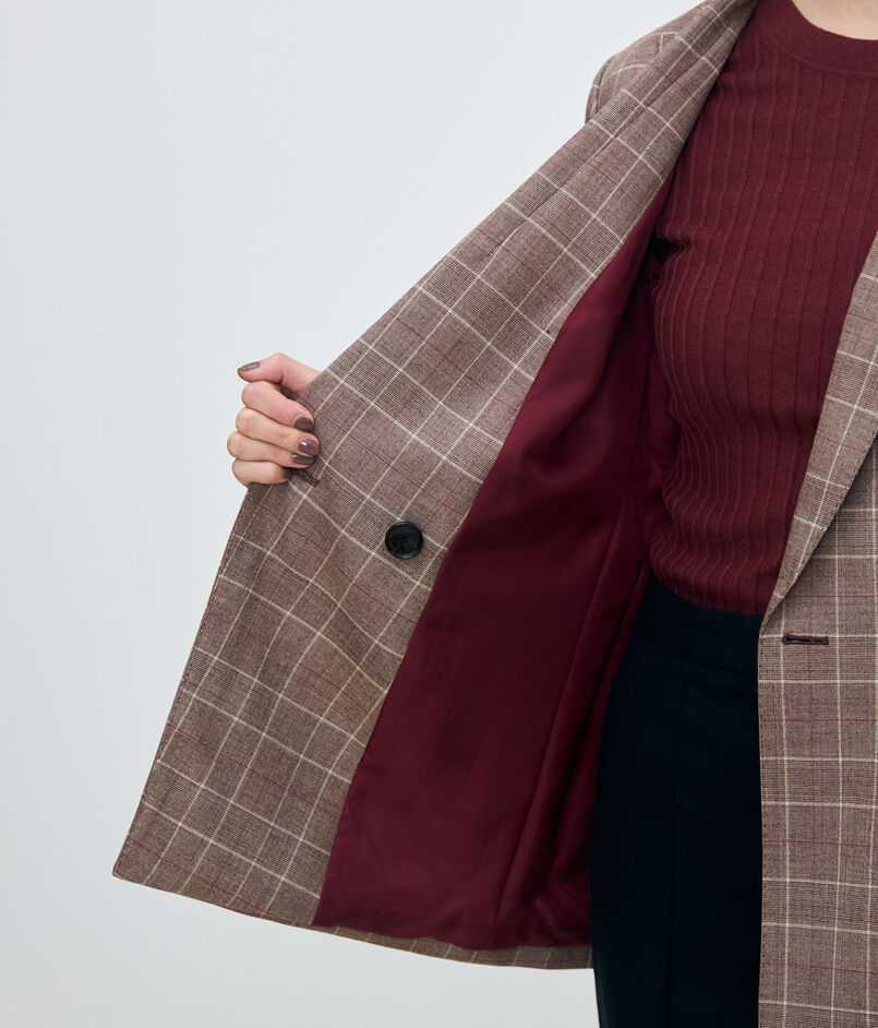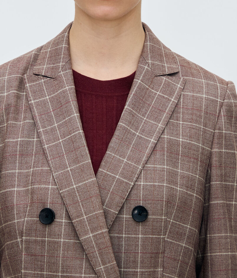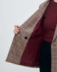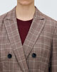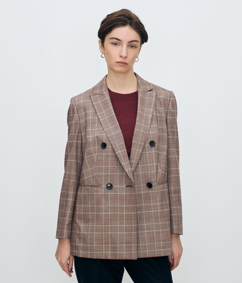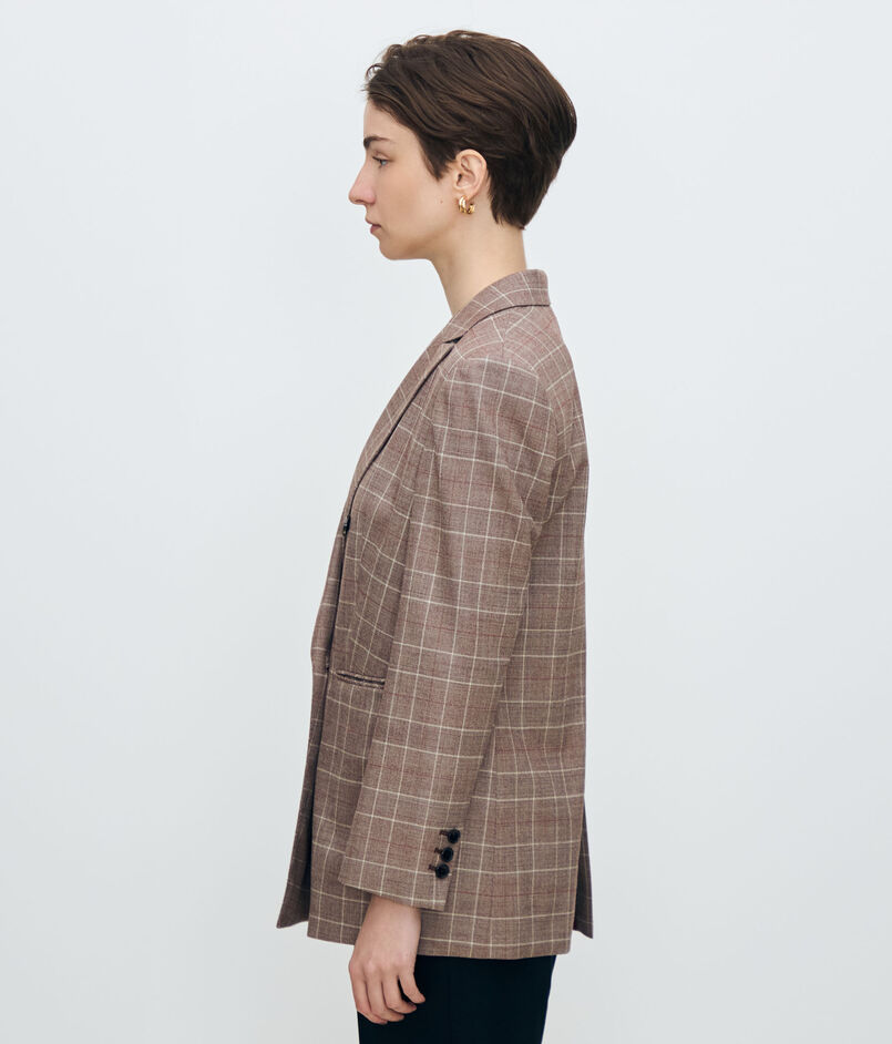 ブラウンベースに秋らしい深みのあるバーガンディーカラーを効かせたチェック柄が目を惹くジャケット。