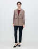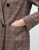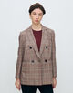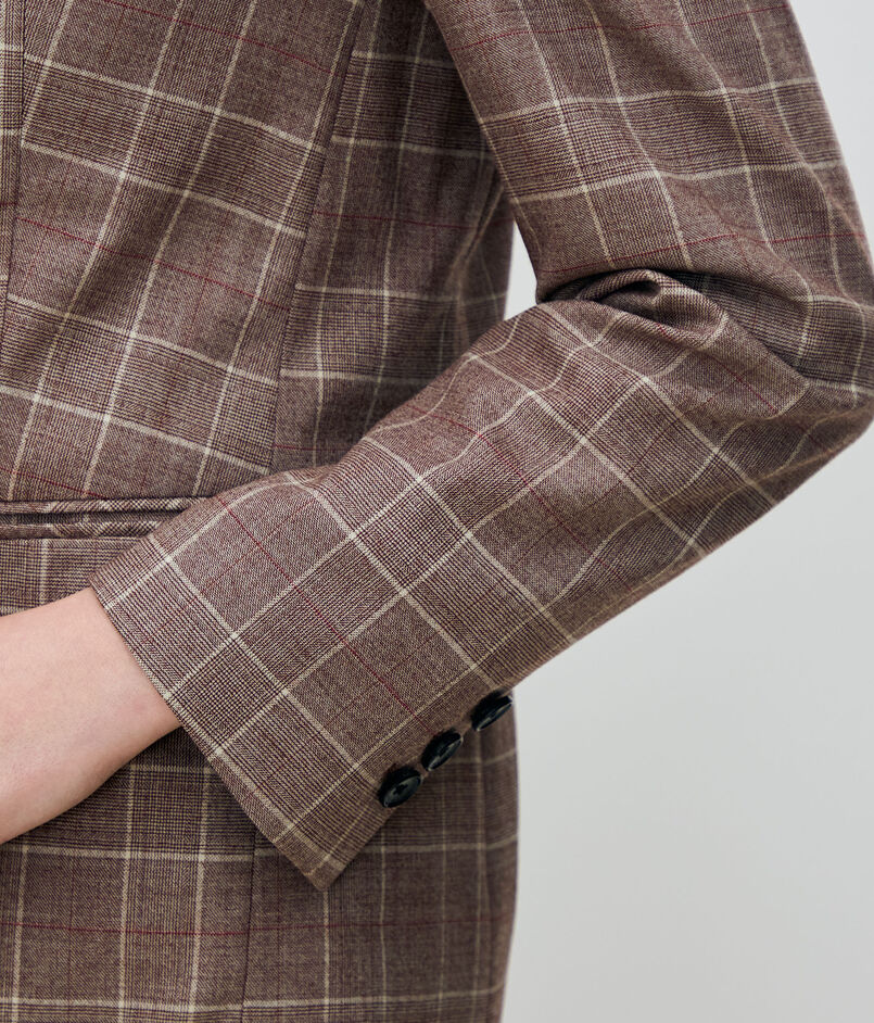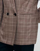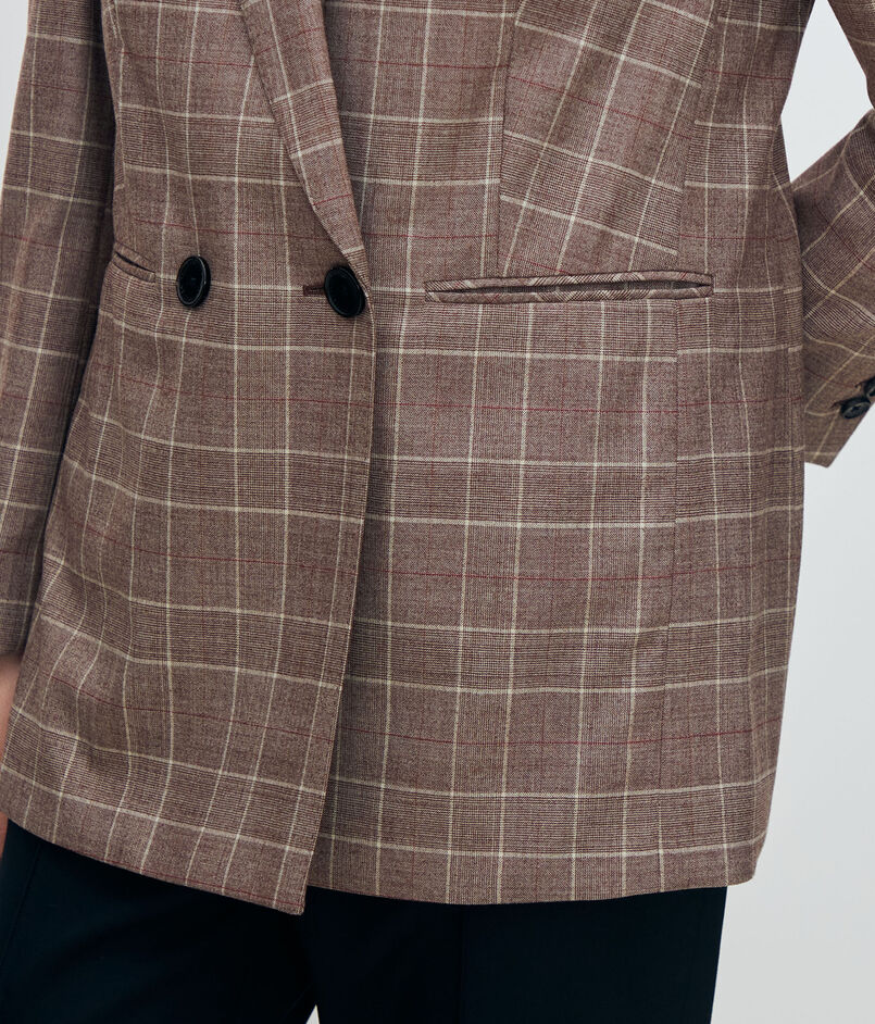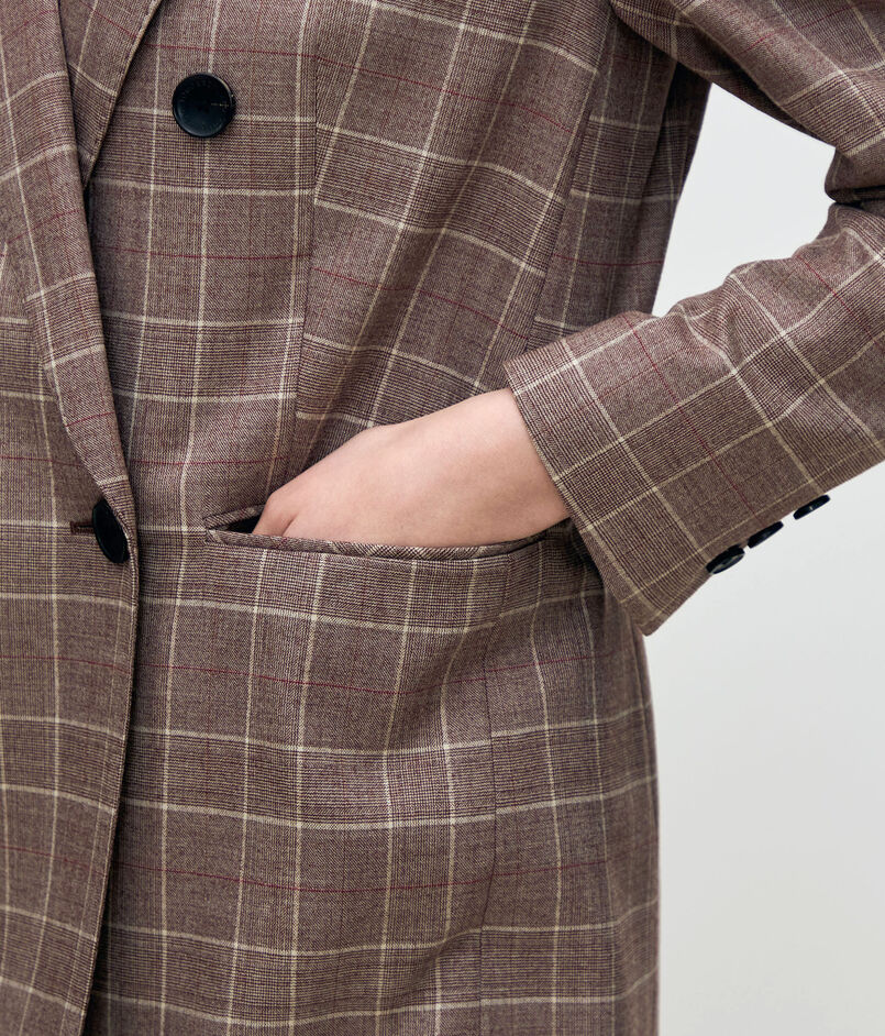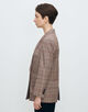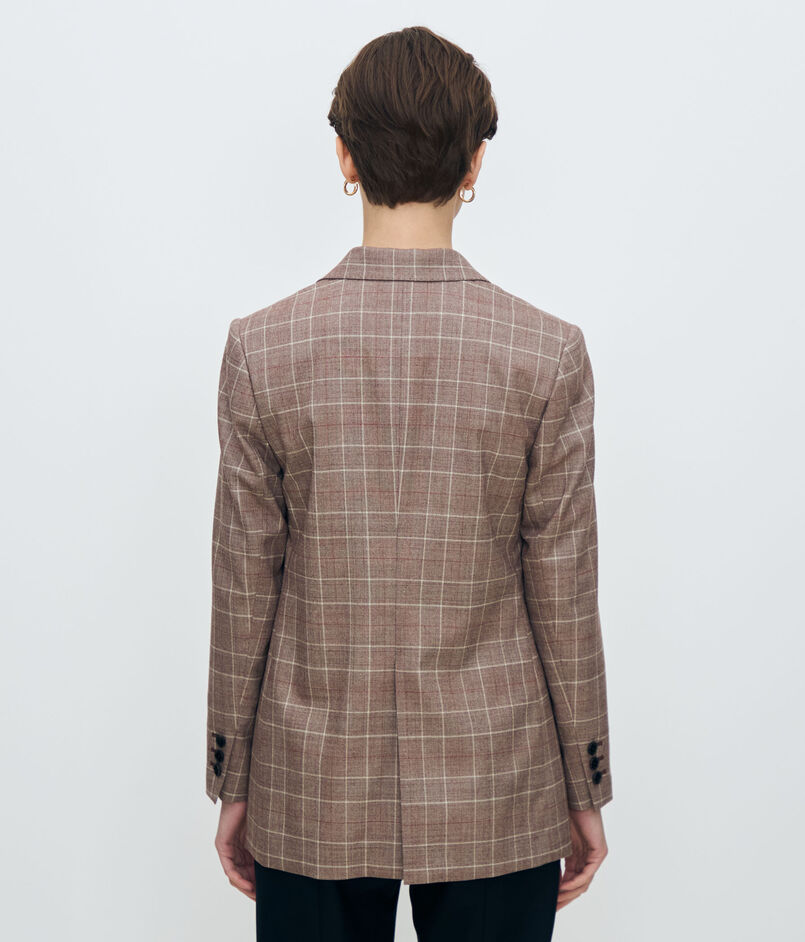 ブラウンベースに秋らしい深みのあるバーガンディーカラーを効かせたチェック柄が目を惹くジャケット。