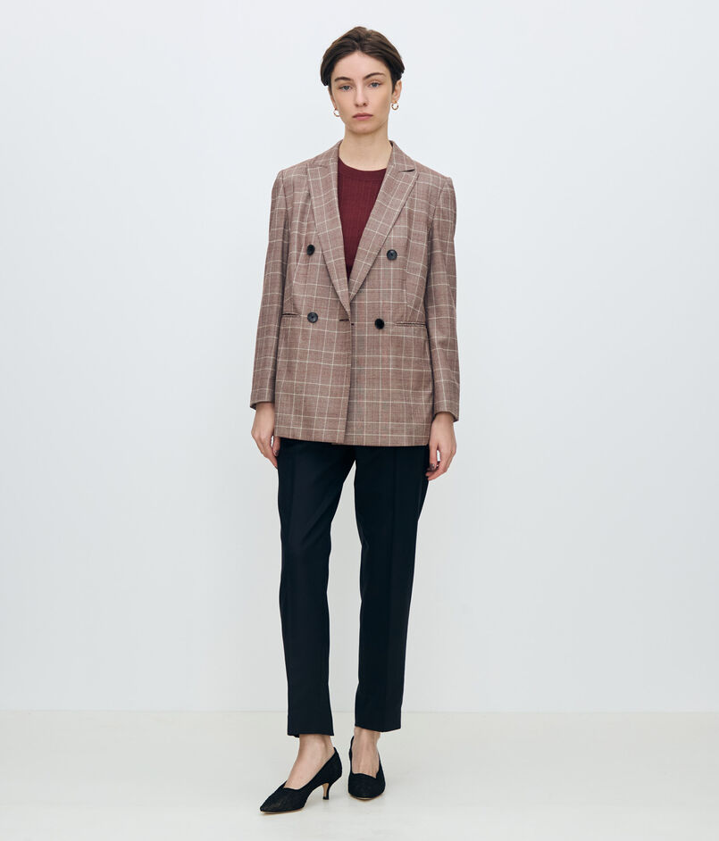 やや幅広のラペルやダブルブレスト、ヒップにかかる長めの着丈でマニッシュなバランスの一着。