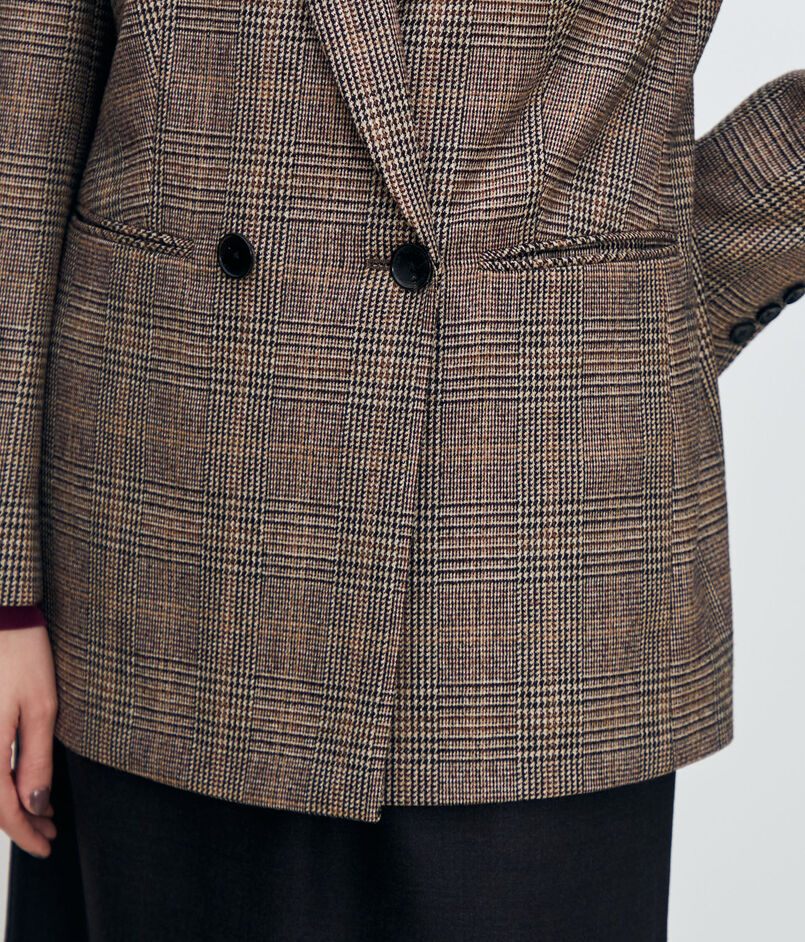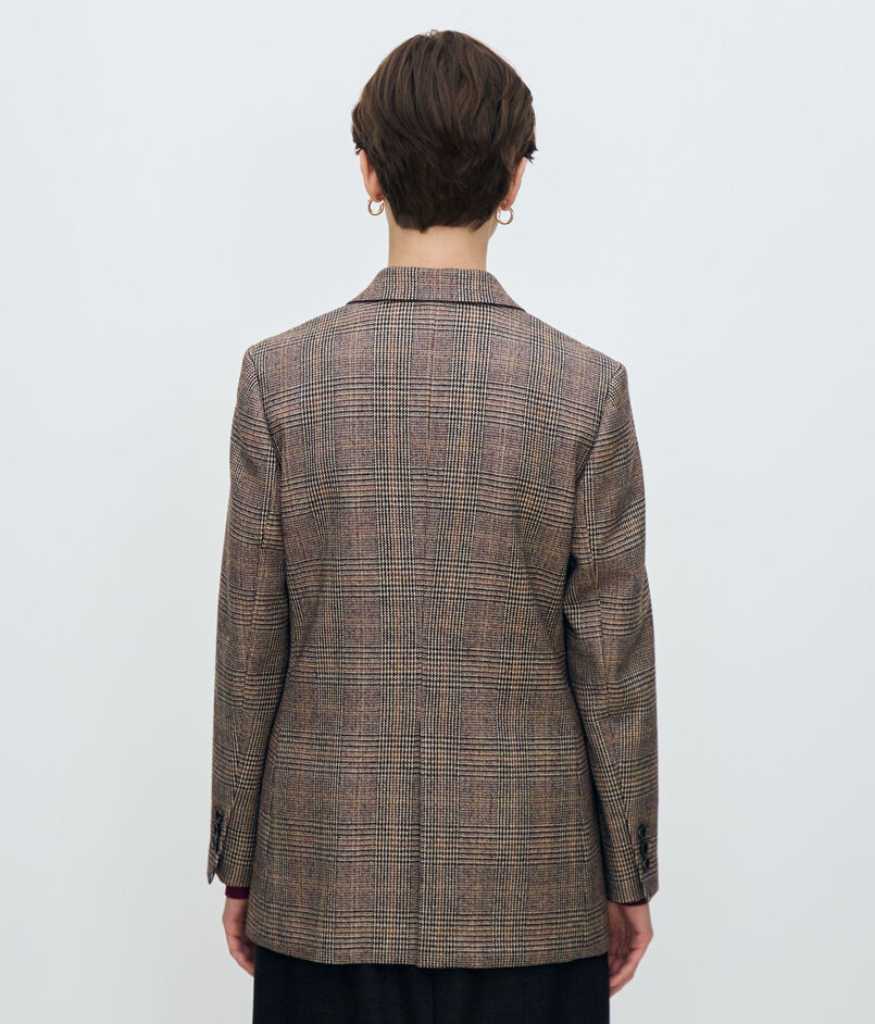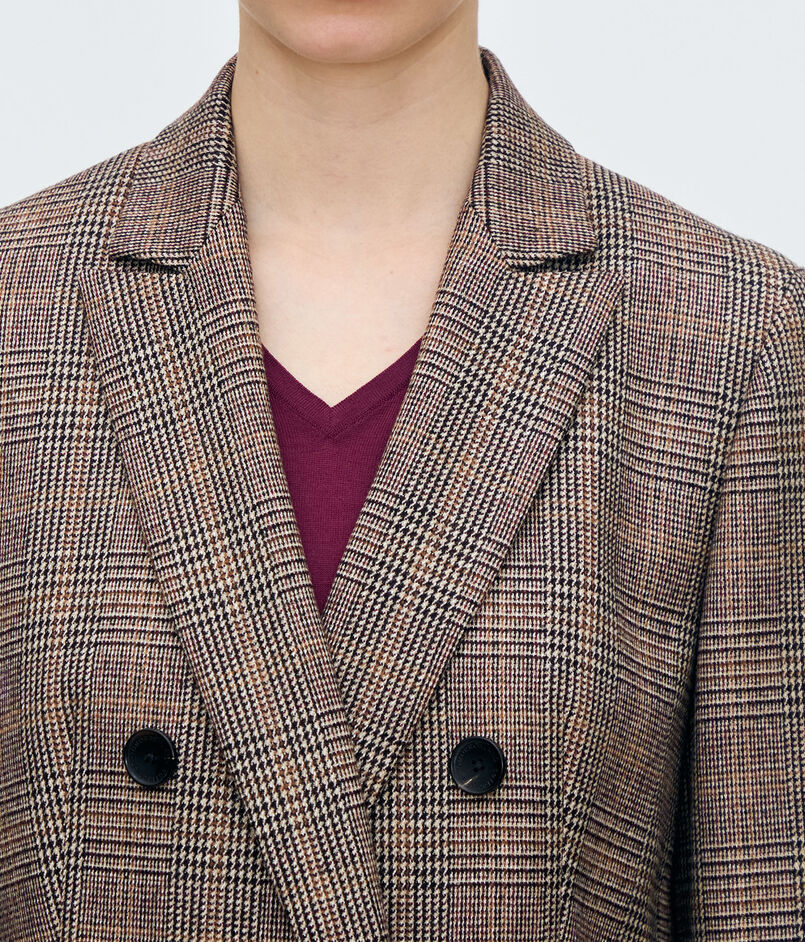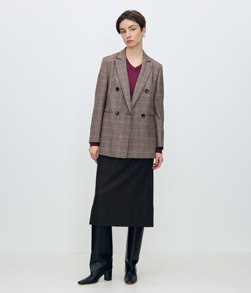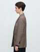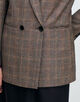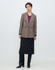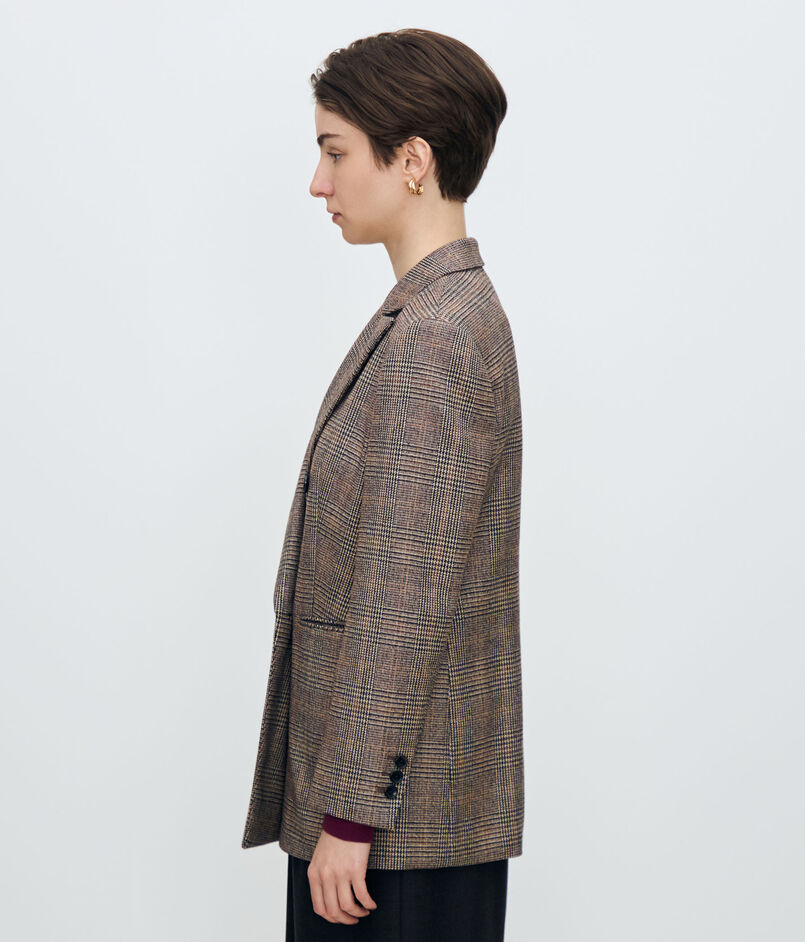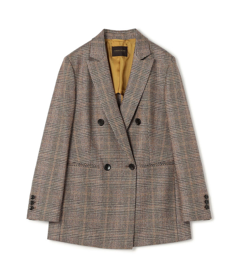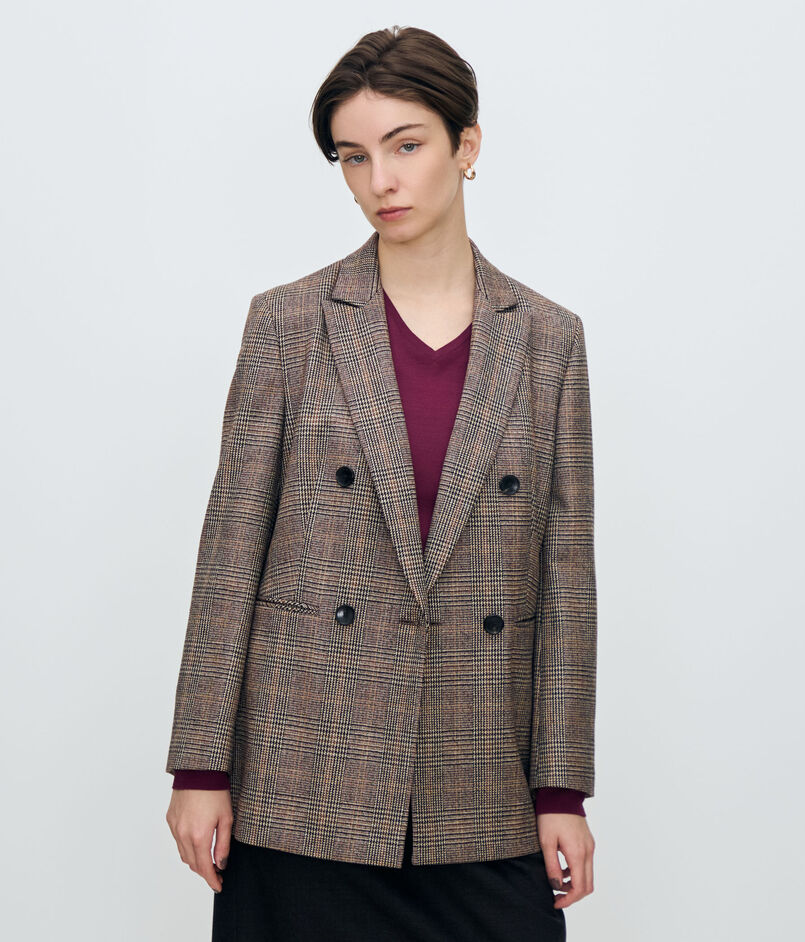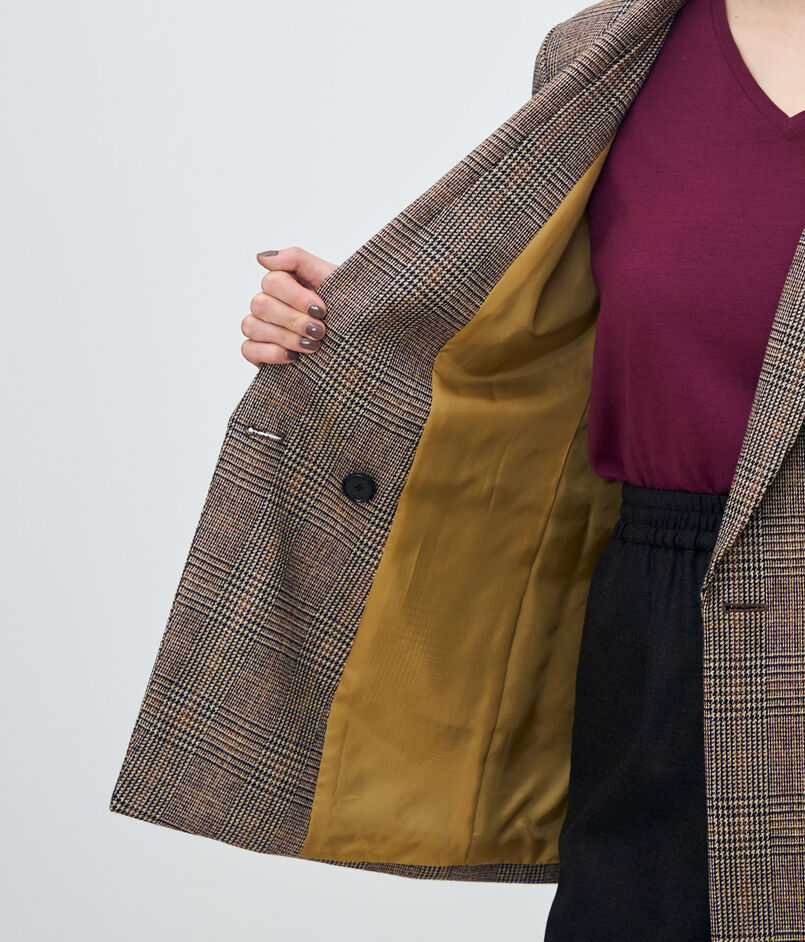 ジャケットはやや幅広のラペルやダブルブレスト、ヒップにかかる長めの着丈でマニッシュなバランスの一着。