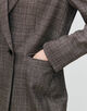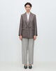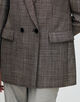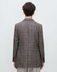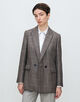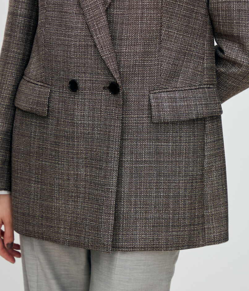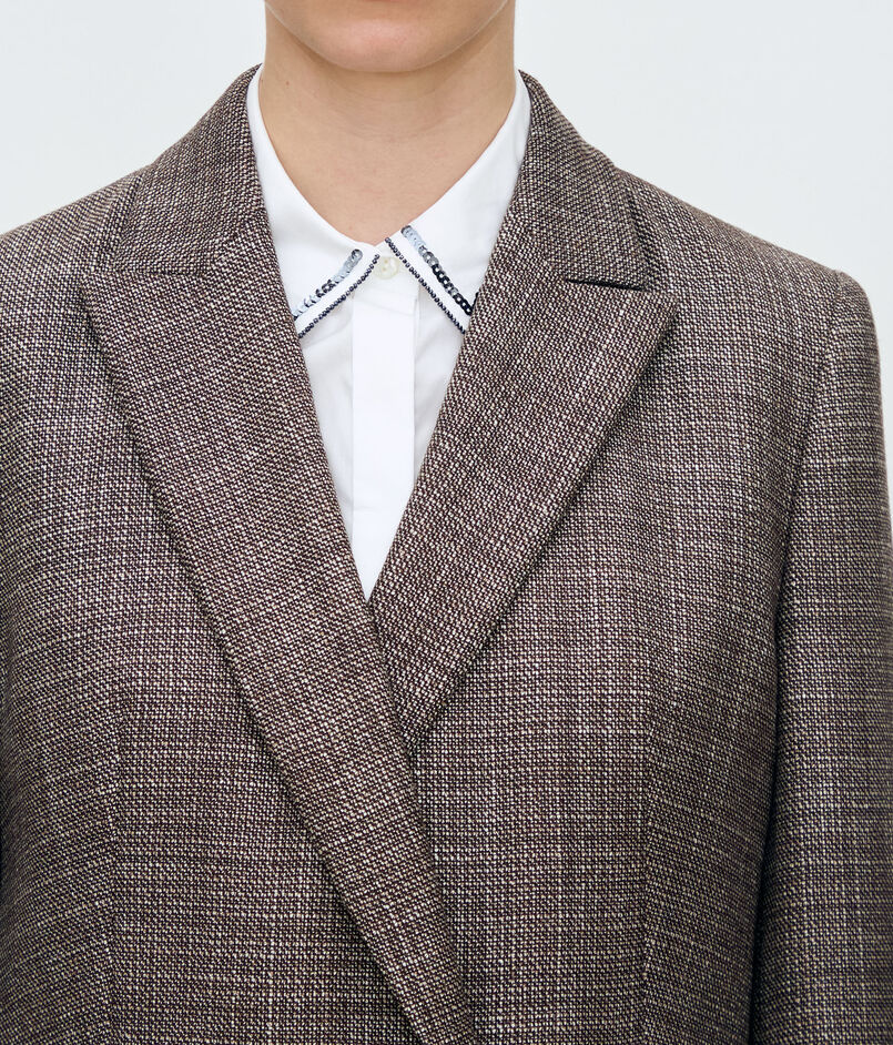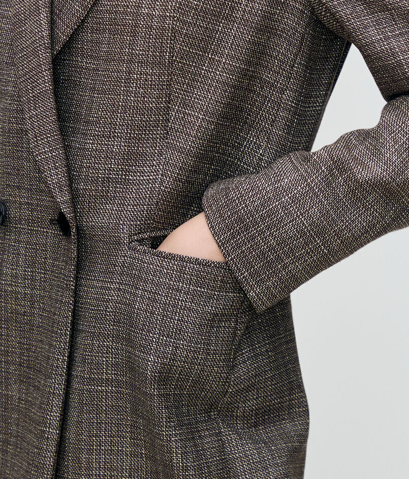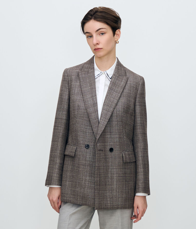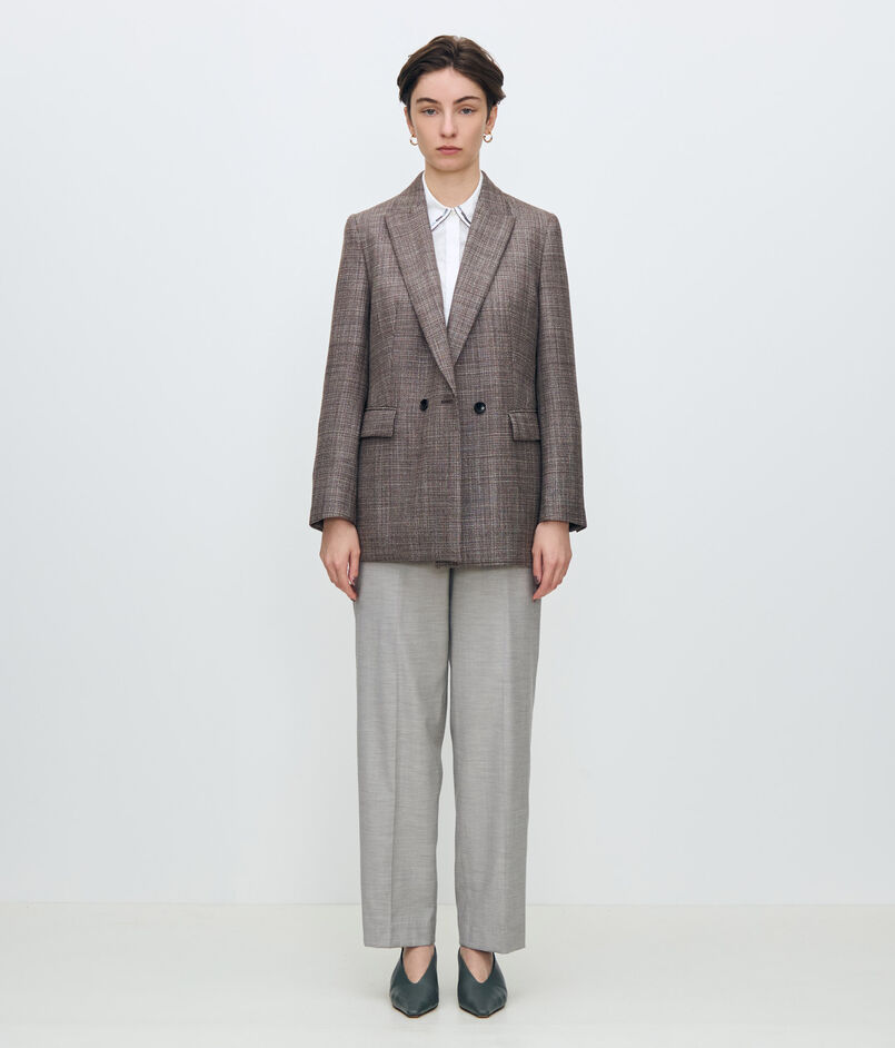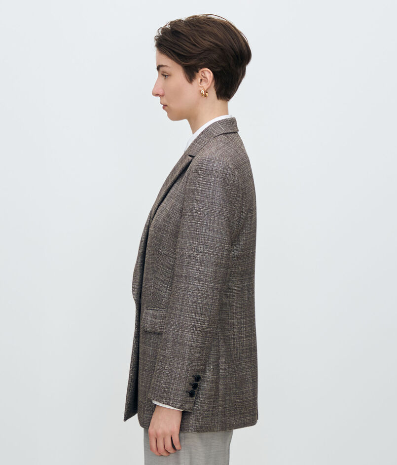セミダブルにやや深めのVネックライン、低めの位置に配したボタンとボクシーなシルエットでメンズライクな雰囲気の一着。