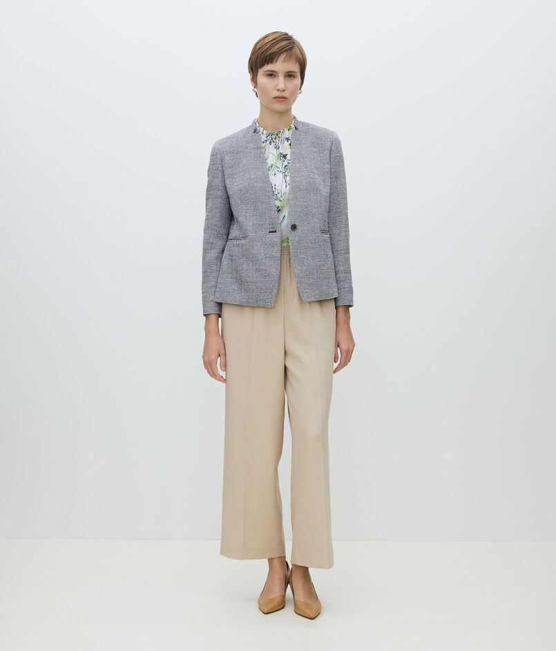 やや短めのコンパクトな丈感とウエストシェイプ、首元に沿って立体的に立ち上がる襟元のシルエットが美しい一着です。