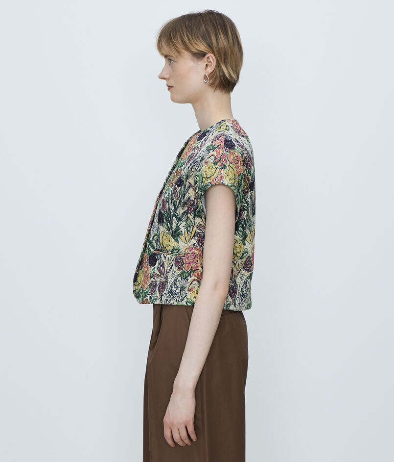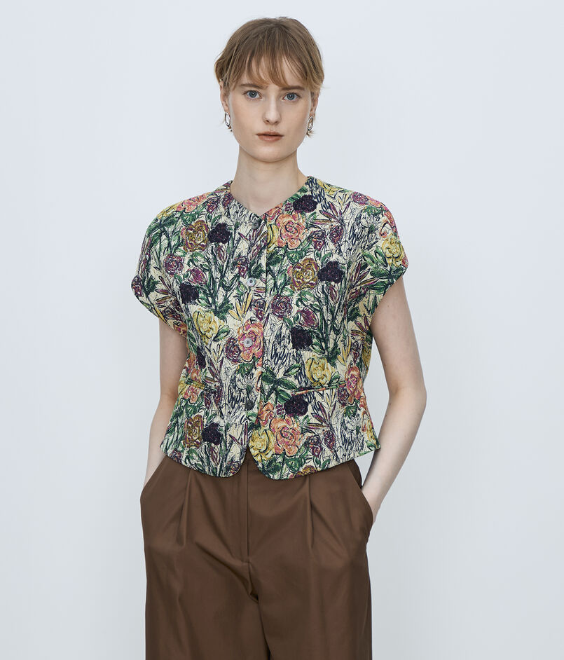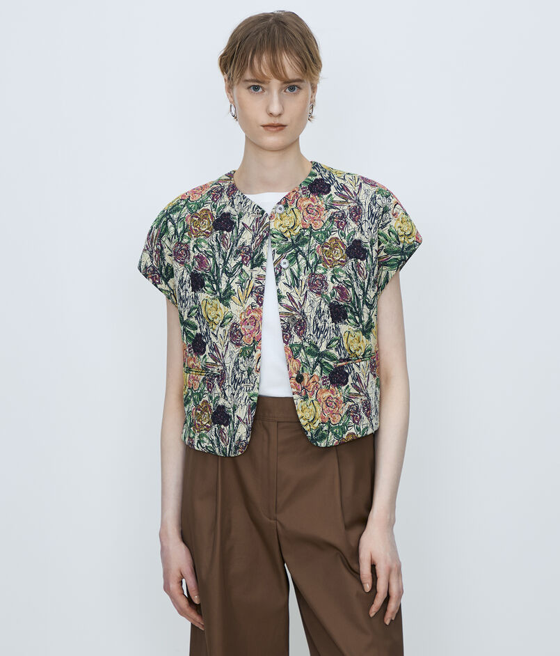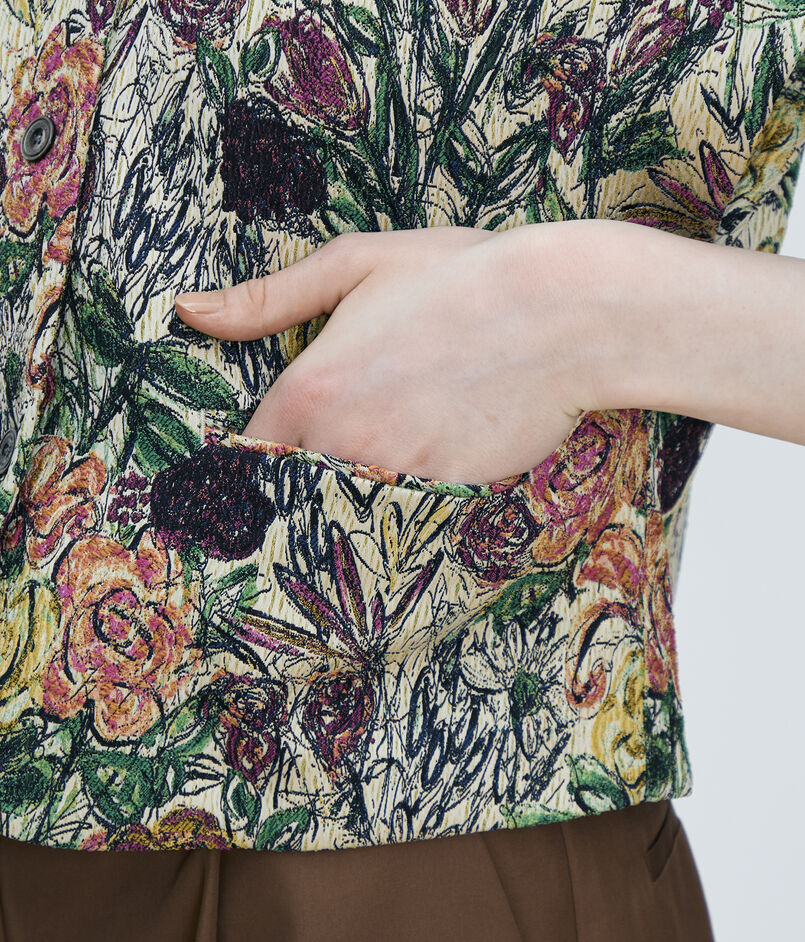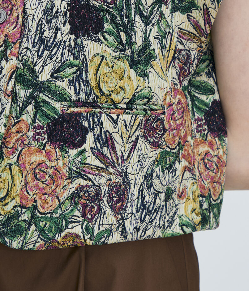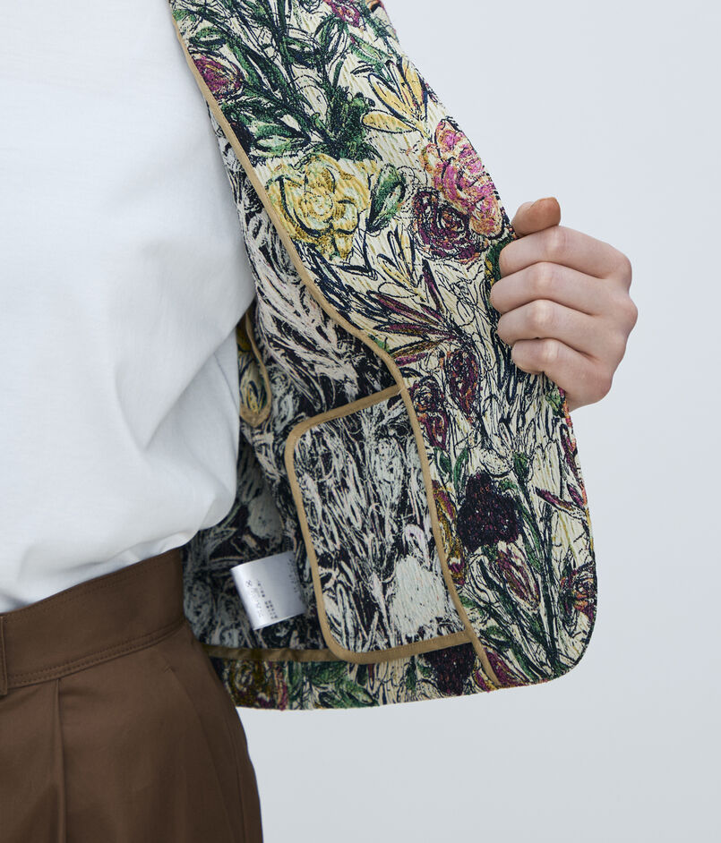 絵画のようなタッチと深みのあるカラー使いで表現した抽象的な花柄が印象的なジャカード素材を使用したジレ。