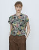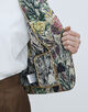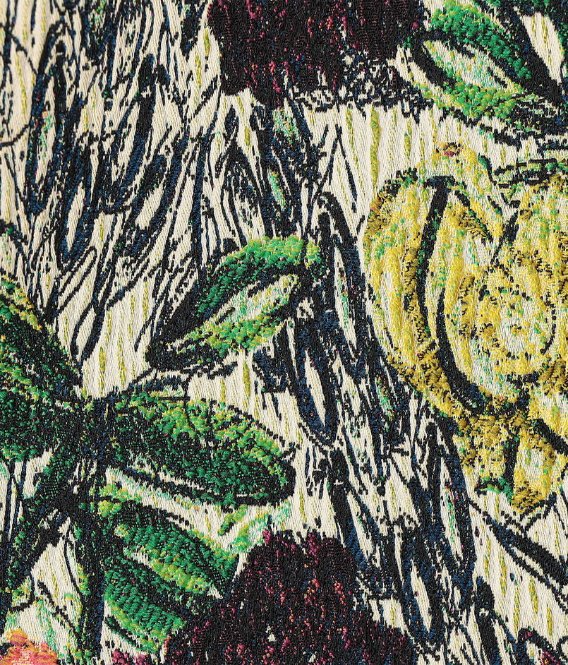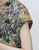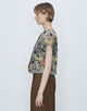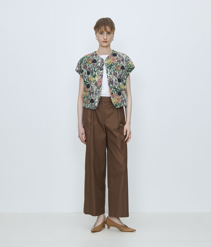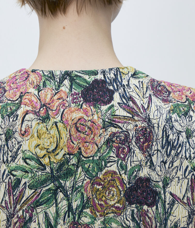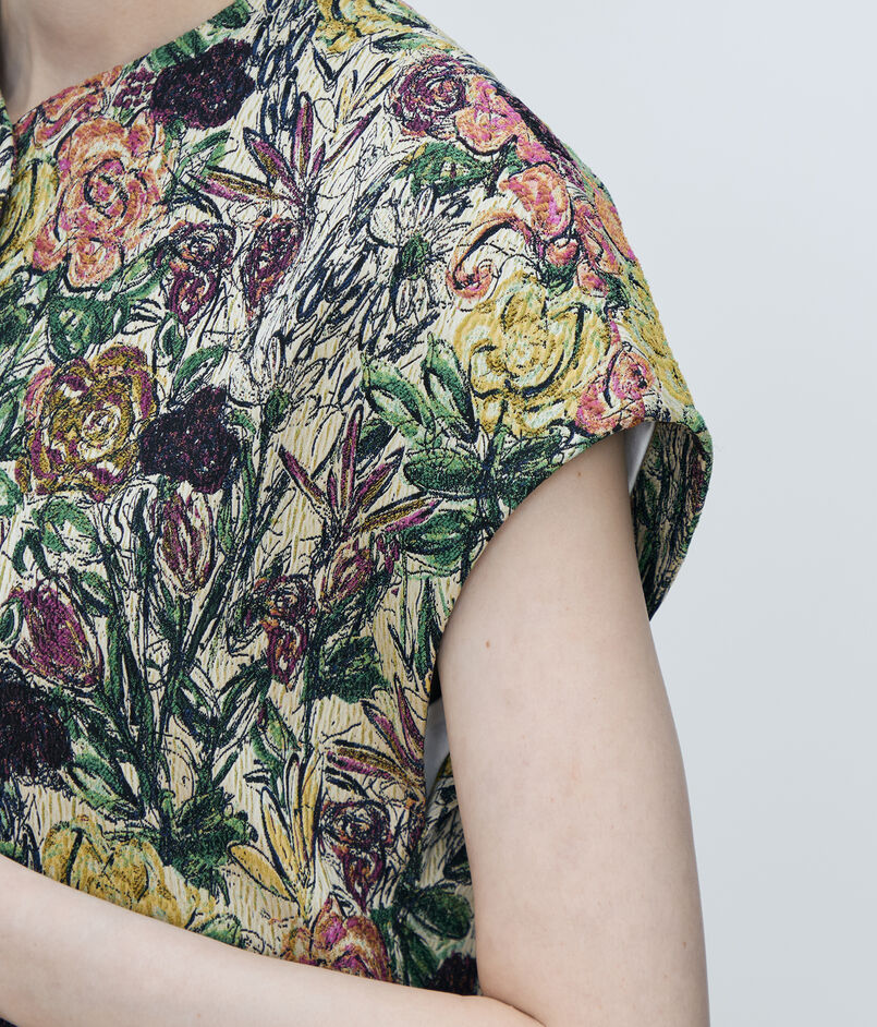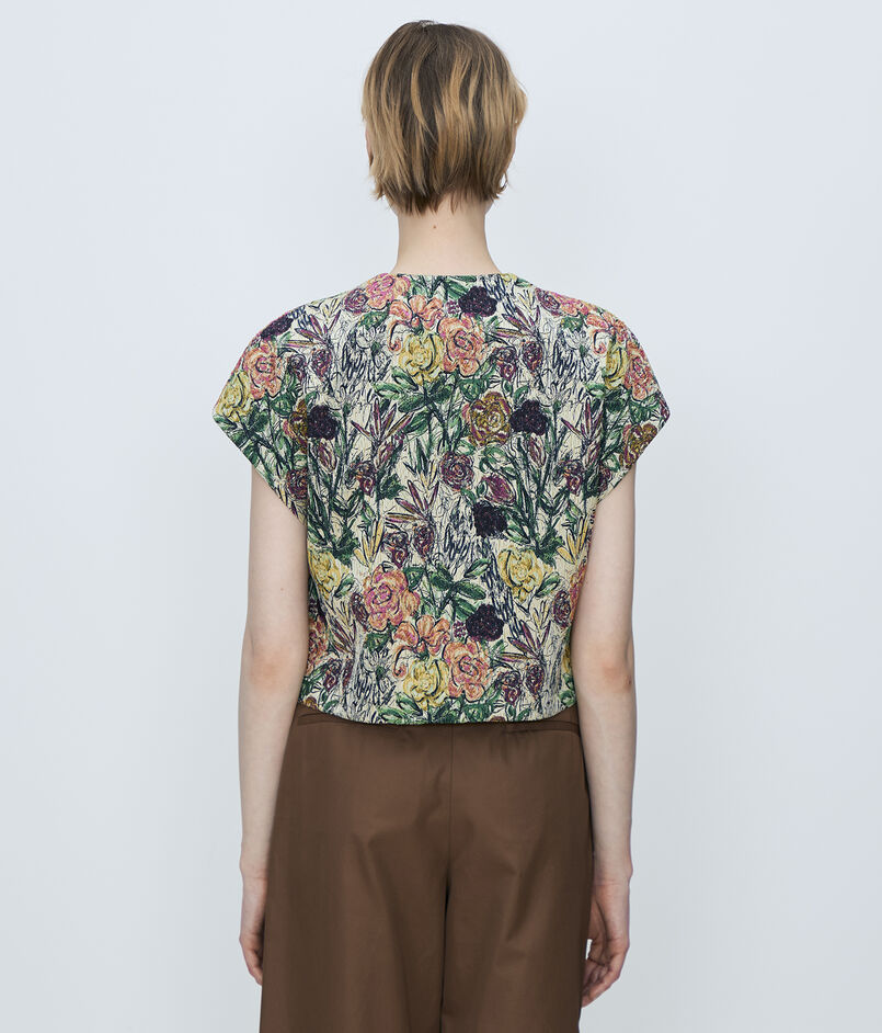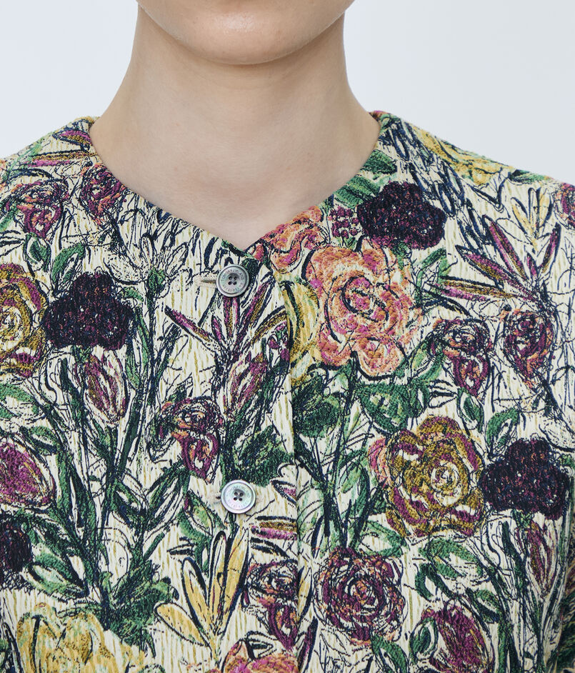 絵画のようなタッチと深みのあるカラー使いで表現した抽象的な花柄が印象的なジャカード素材を使用したジレ。
