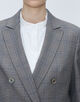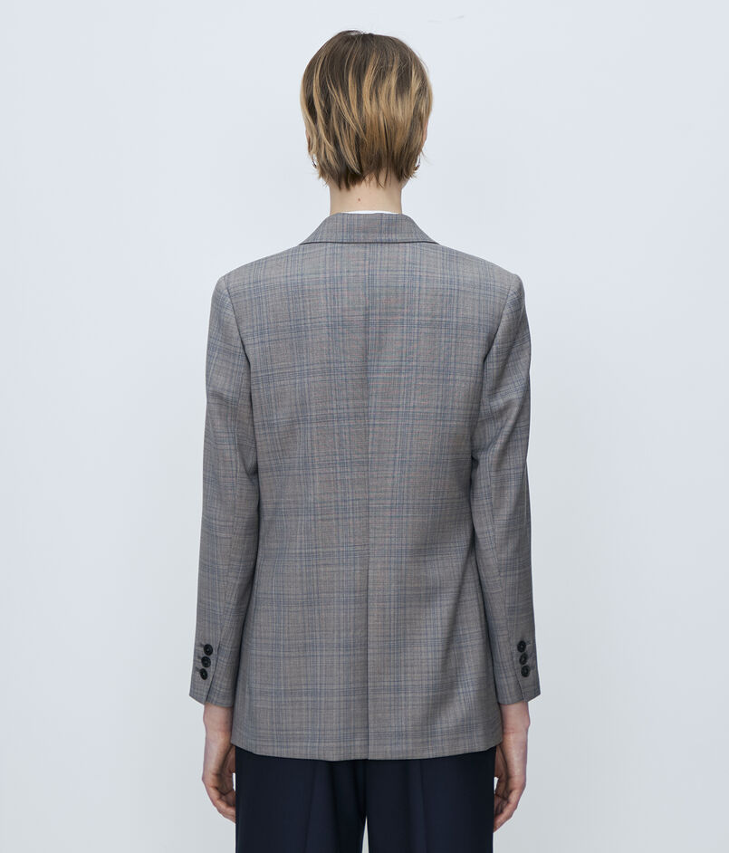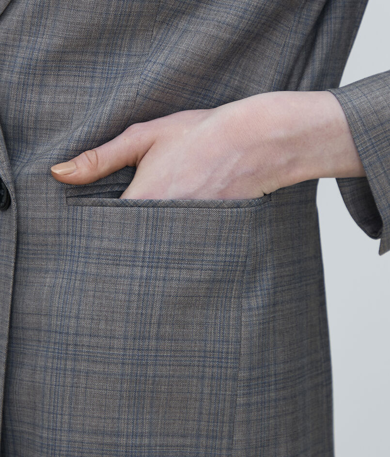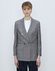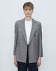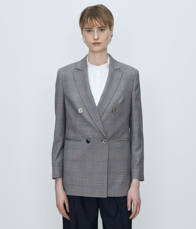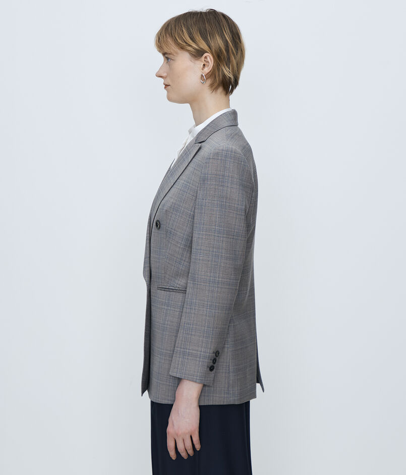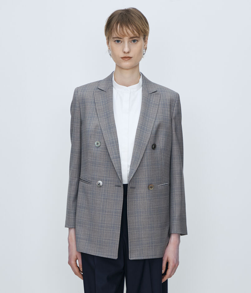 マニッシュな印象のダブルブレストデザインながら、ショルダーからスリーブにかけてのなだらかなラインや適度にウエストをシェイプさせたシルエットで女性らしいバランスに。