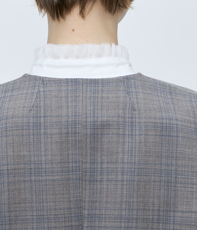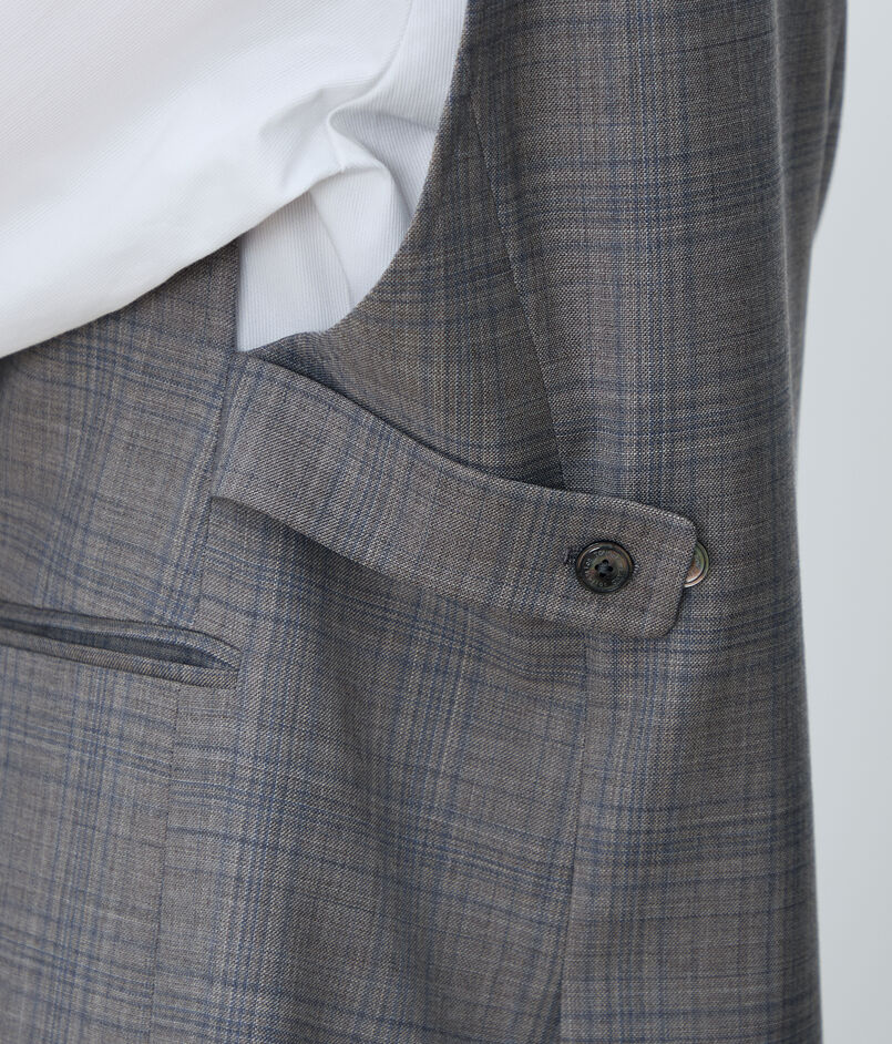 深めのサイドベンツとアジャスターがデザインポイントのボクシーなシルエットで、着こなしに合わせてウエストのボタンでシェイプ具合の調整が可能。