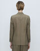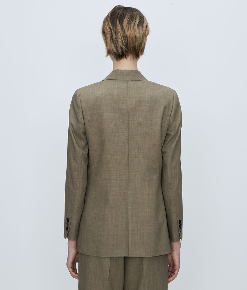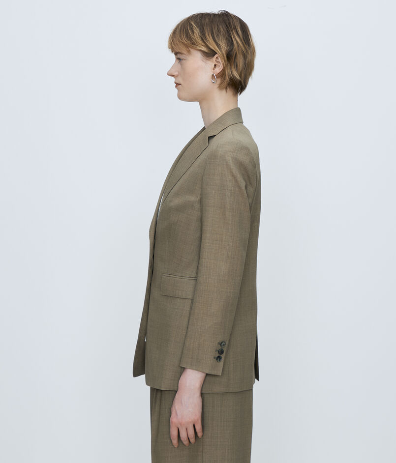 肩から袖山にかけて盛り上がりのないナチュラルショルダーですっきりとしたシルエットの一着。