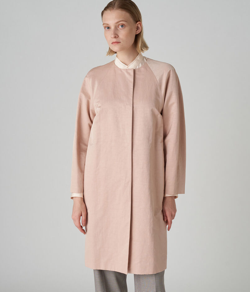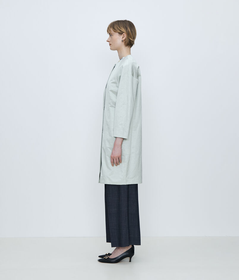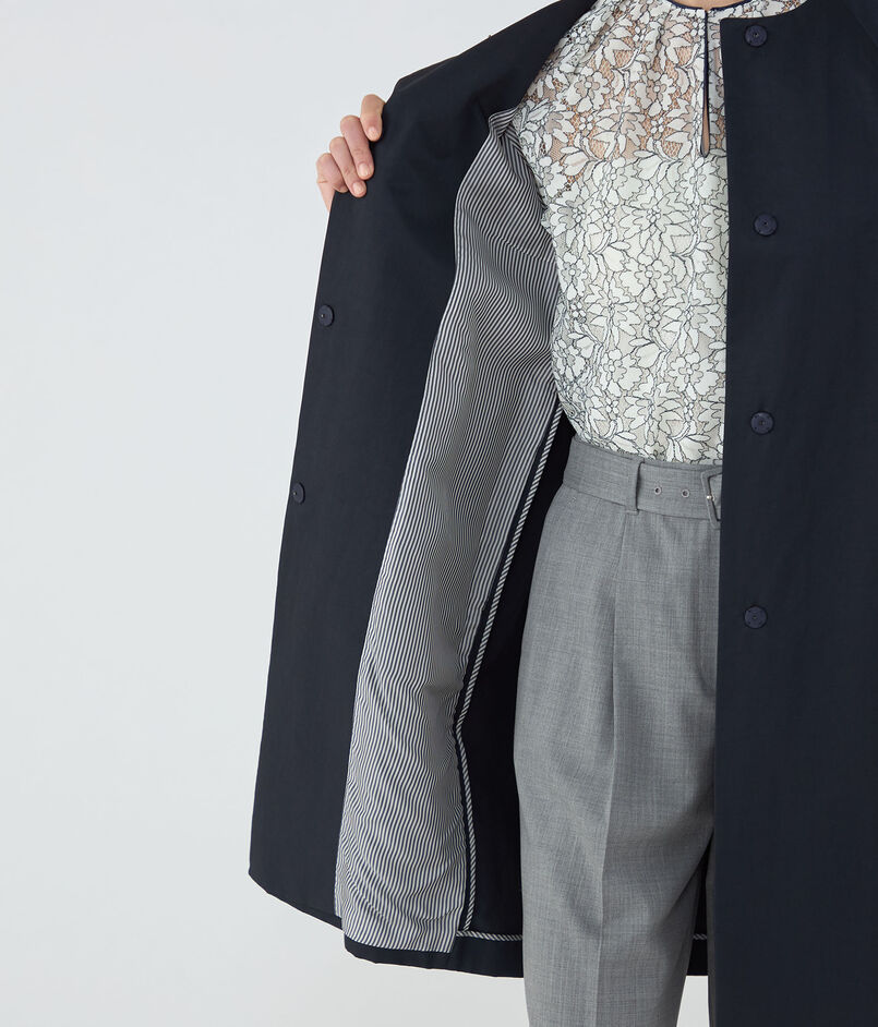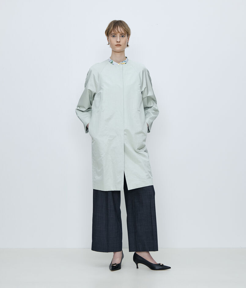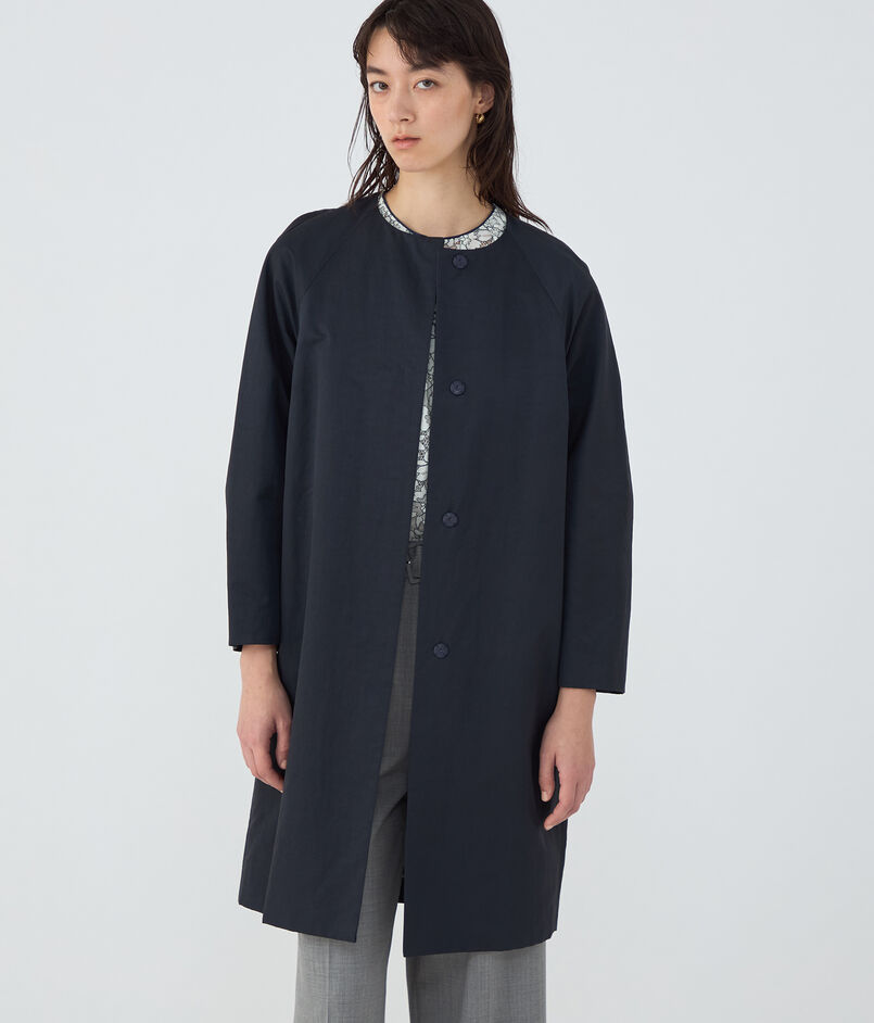 〈TOMORROWLAND collection〉定番人気の、繊細な光沢が特徴の上質なインポート素材を使用したノーカラーコート。