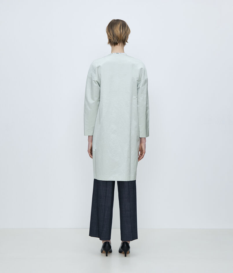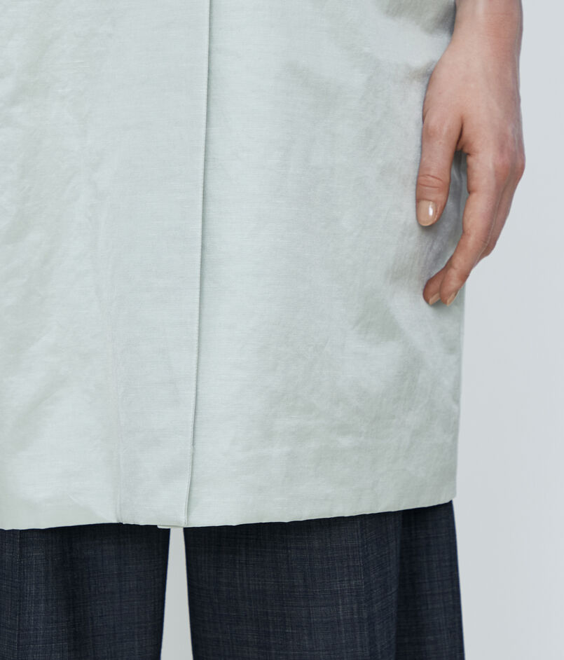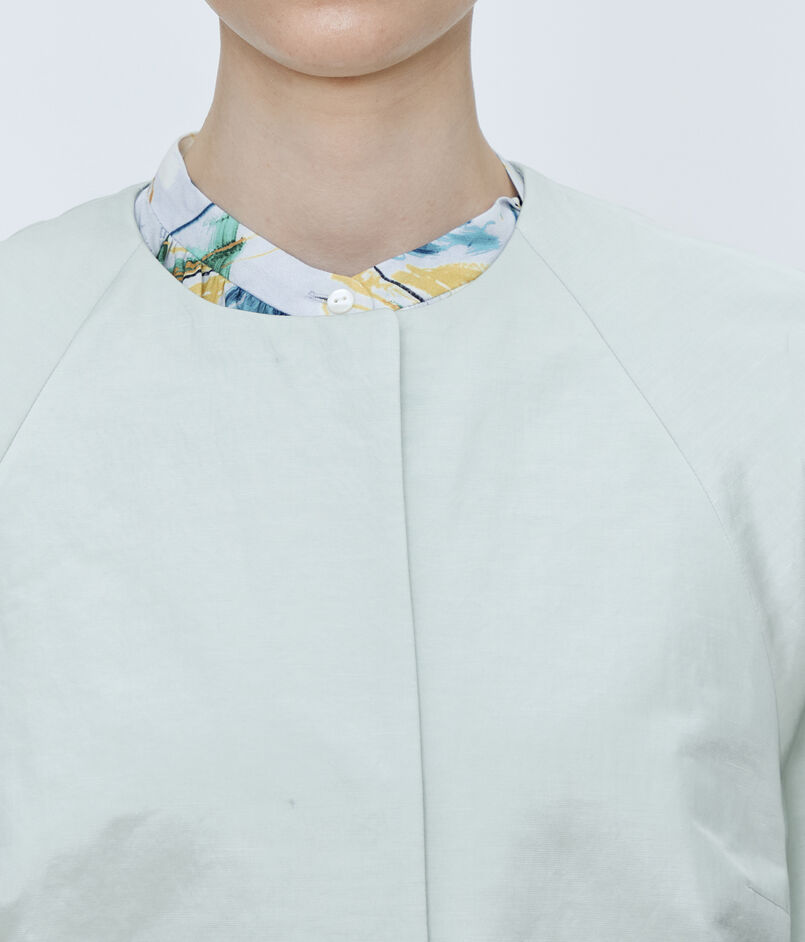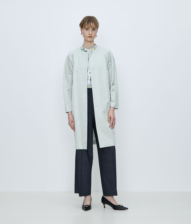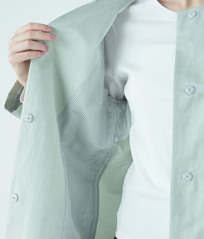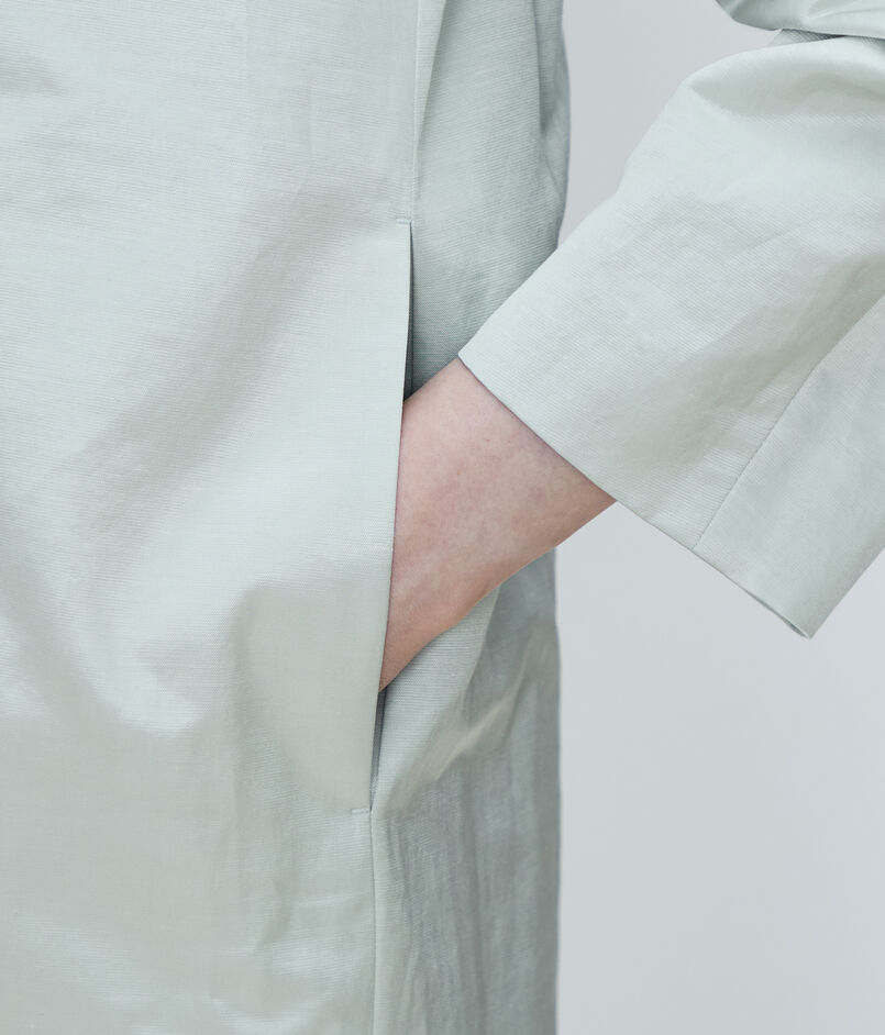 〈TOMORROWLAND collection〉定番人気の、繊細な光沢が特徴の上質なインポート素材を使用したノーカラーコート。