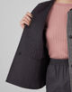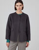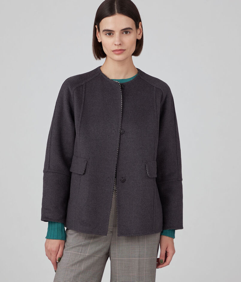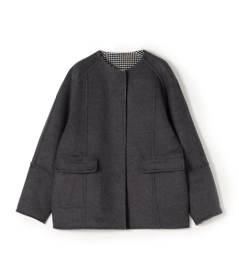 シンプルなノーカラーのコートは、リバーシブルで着用できる仕様。