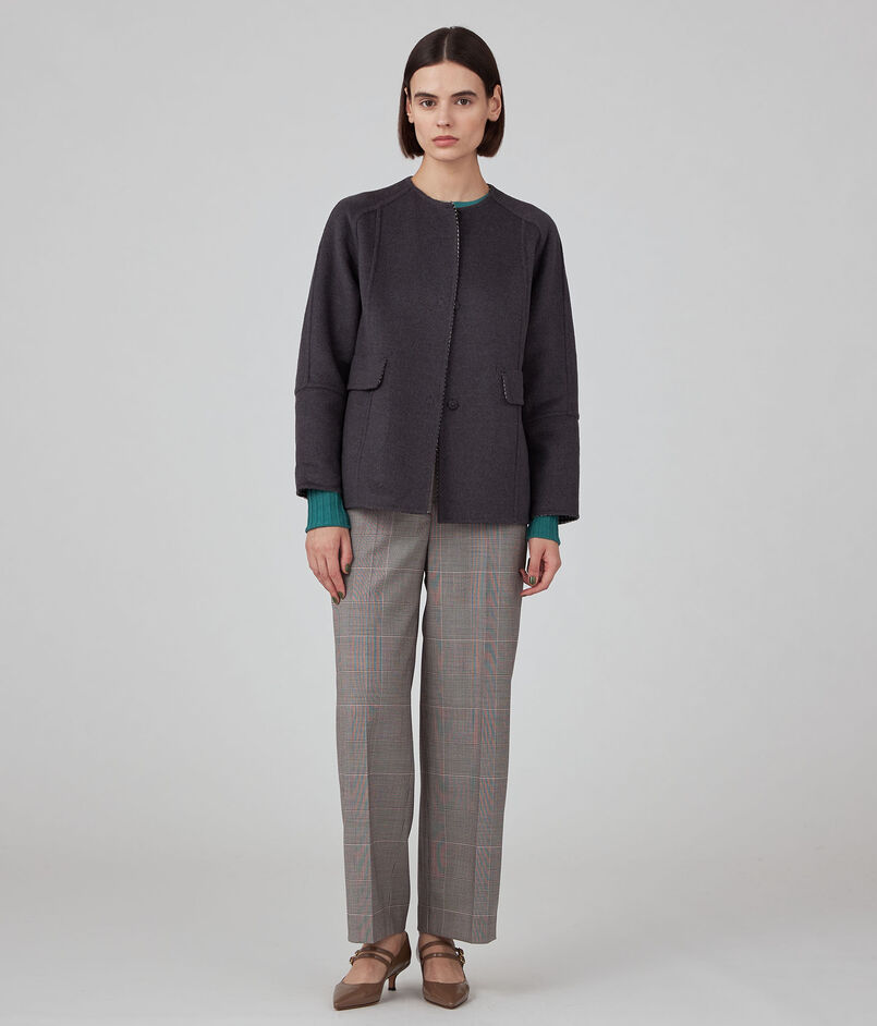 上品な光沢のウールのダブルフェイス素材を使用したコート。