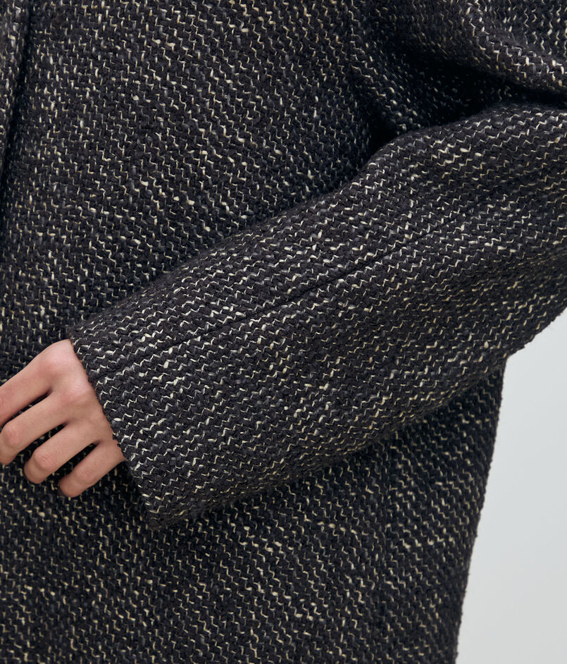 テープ状にカットした糸を撚ることで膨らみと表情感を持たせた糸で織り上げた、ボリューム感がありながらも軽さのある生地を使用しています。