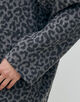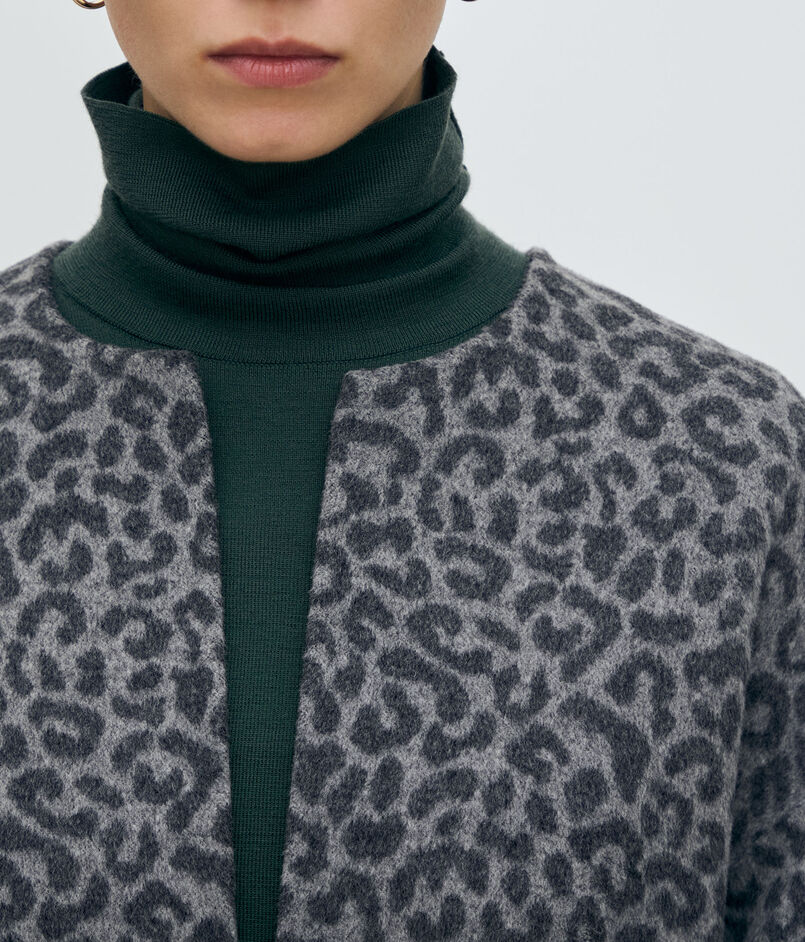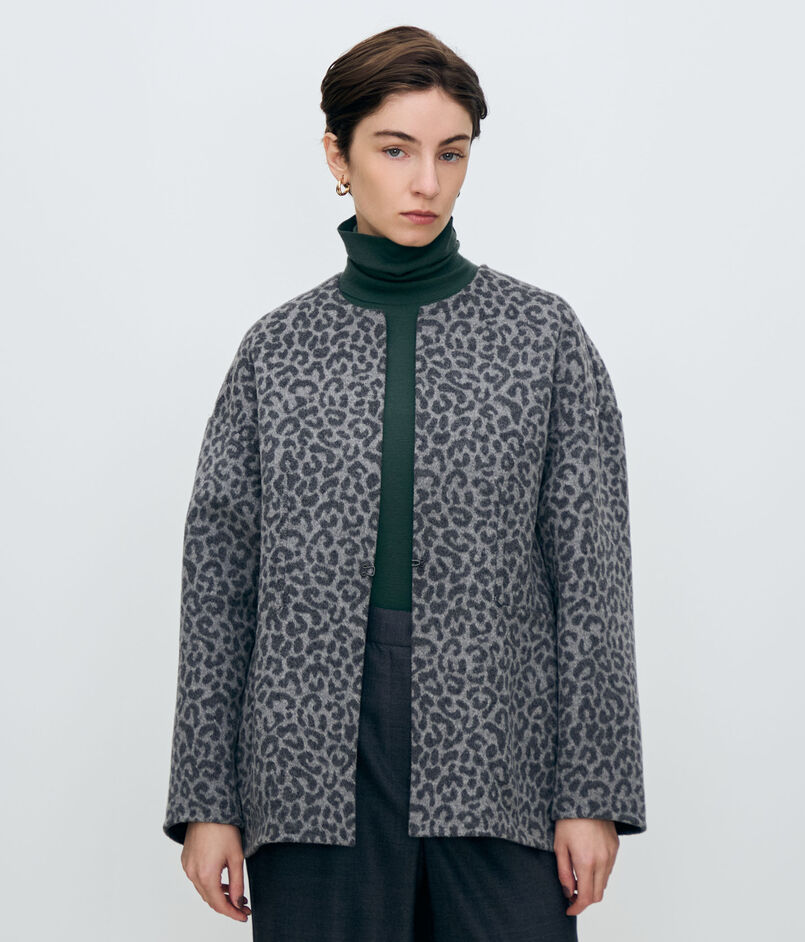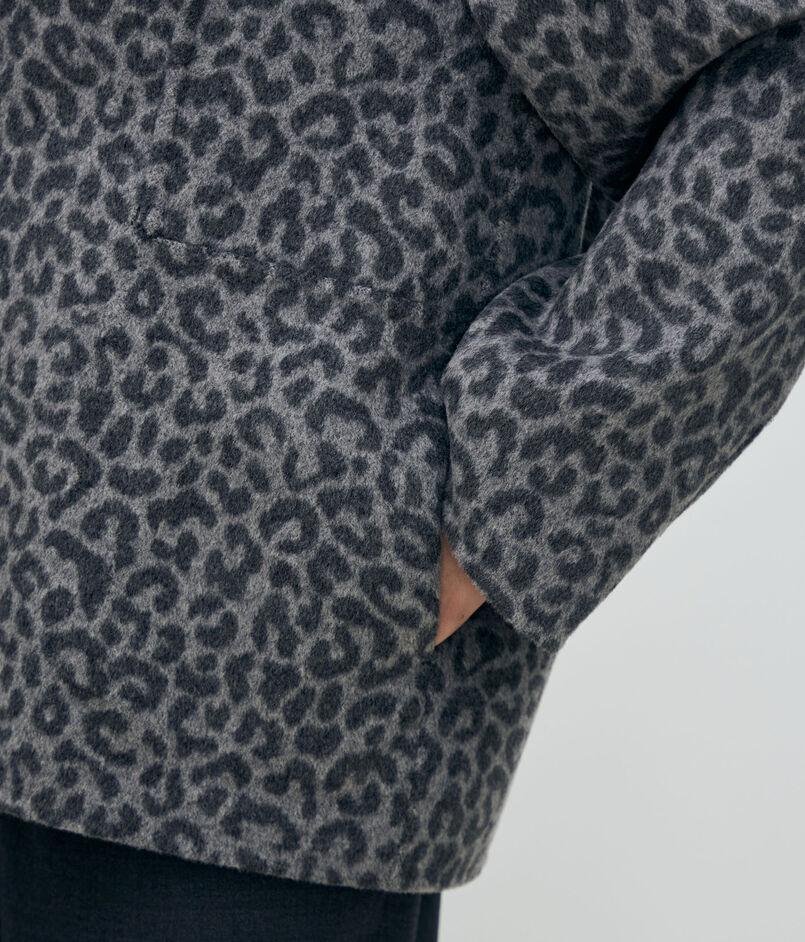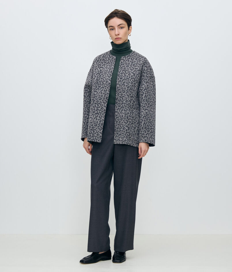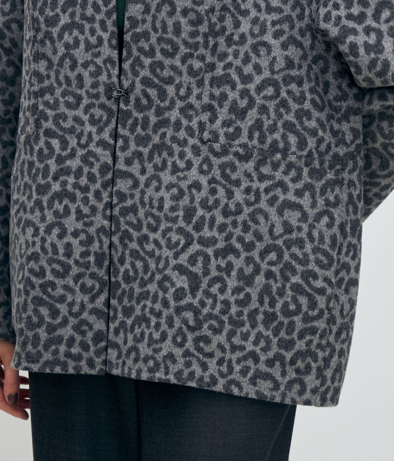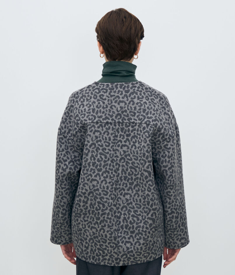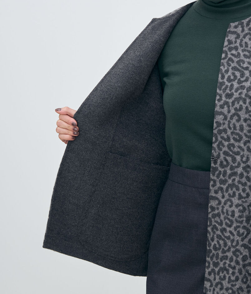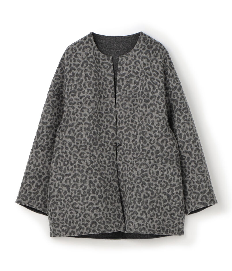 柔らかなグレートーンのレオパード柄のアクセントが魅力的なコート。