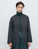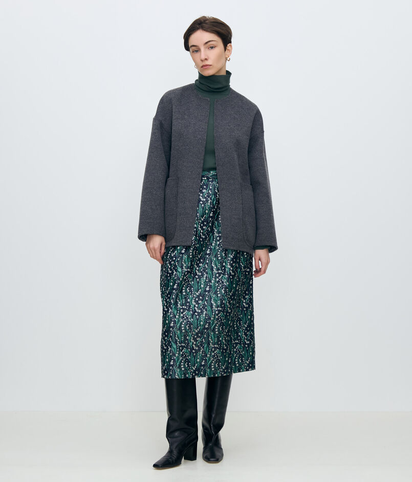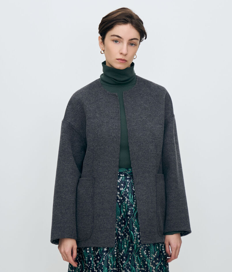 ヒップにかかる着丈と丸みのあるショルダーラインで女性らしい印象ながら、身頃にダーツを入れることでほど良くシャープさをプラスした一着。