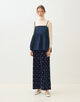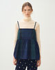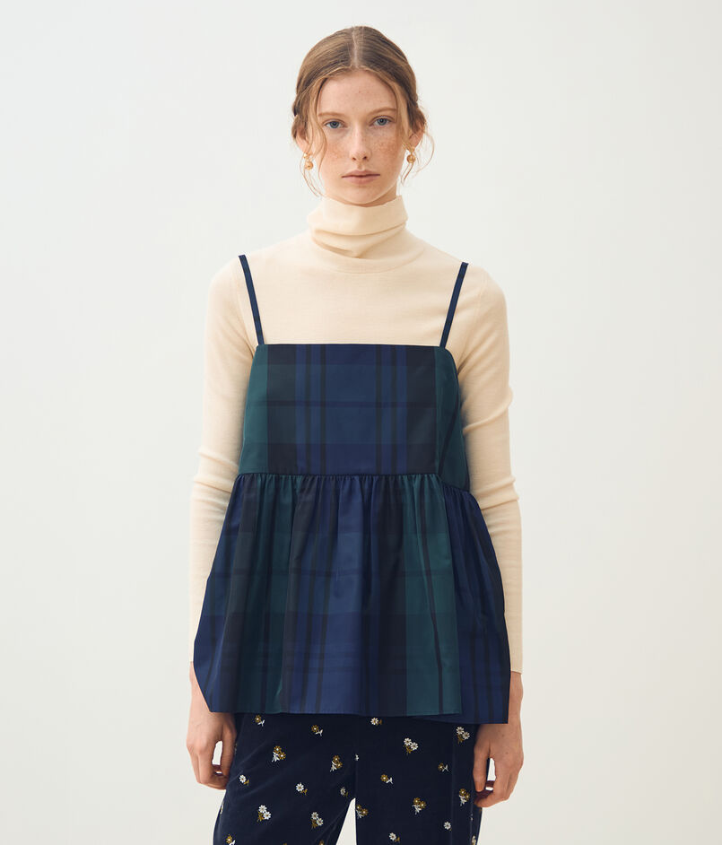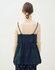 トップスは華奢なストラップと胸下からふわりと広がるペプラムシルエットでガーリーな印象の一着。